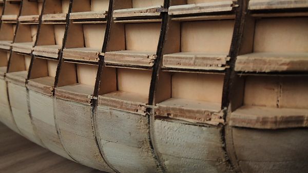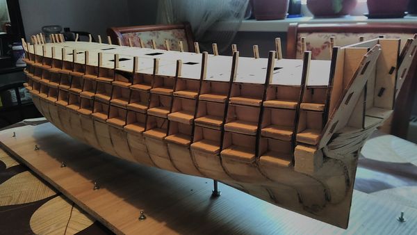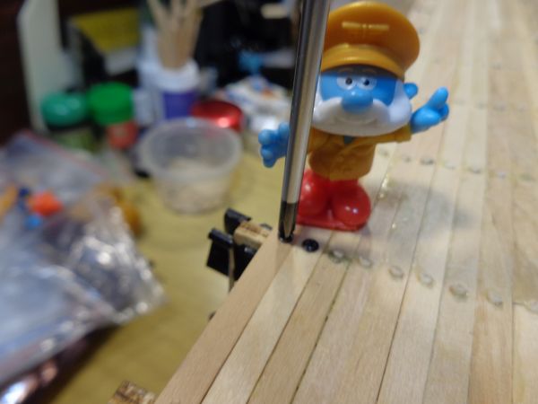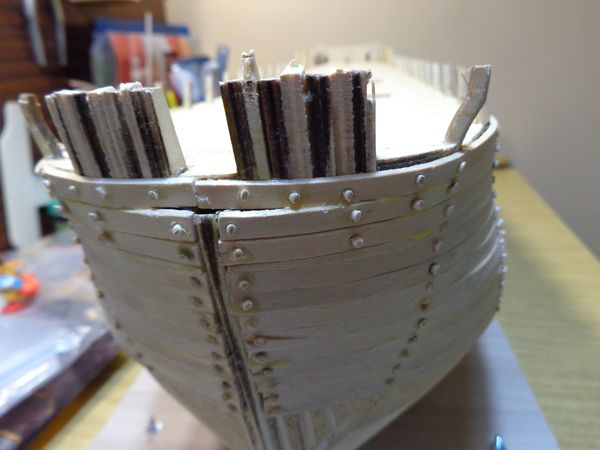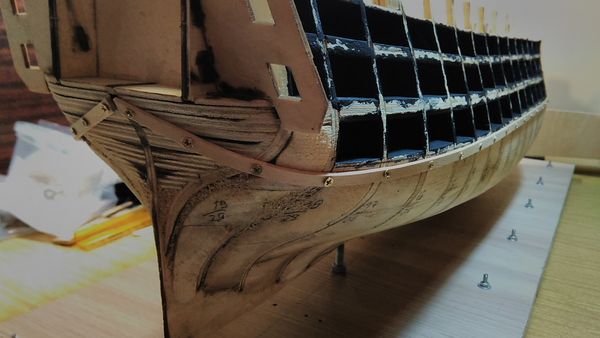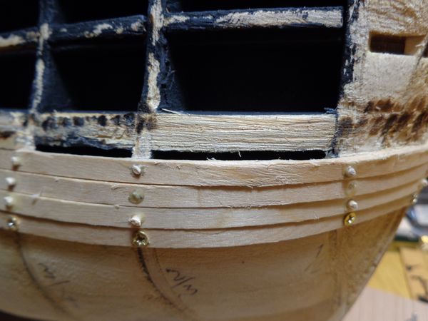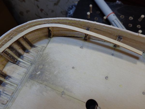 Не обошлось без поломки топтимберсов, уже в зоне кормы, с одной стороны. Один я сломал при подготовке корпуса к малковке выше палубы гон-дека, второй я сломал уже непосредственно при малковке. Склеил и укрепил с помощью кусочков фанеры 6 мм, т.к. в этом месте внутреннее пространство модели будет скрыто обшивкой бортов и палубой полубака.