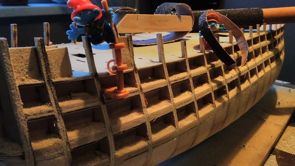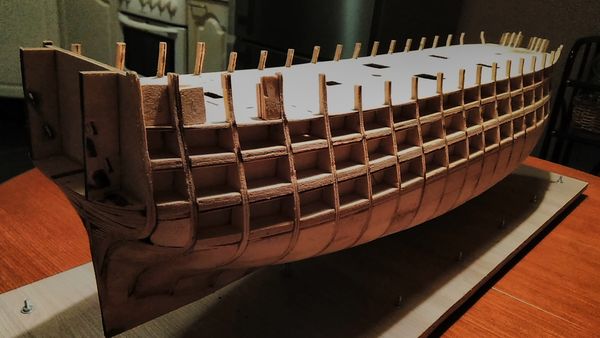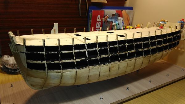 Корпус модели готов к покраске внутренних поверхностей пушечных портов.