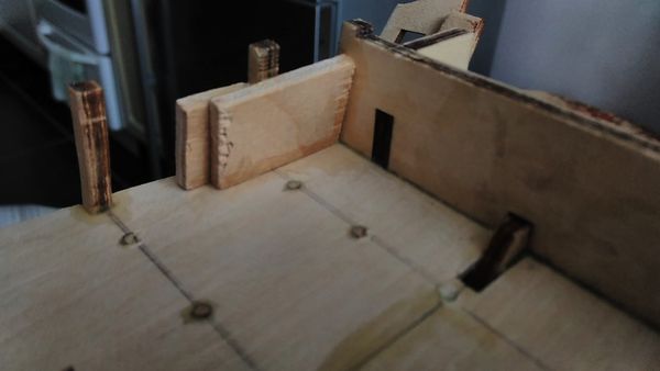 Также решил доработать переборки офицерских кают. Нарастил переборки на ~ 2 мм в нижней части и тогда палуба выровнялась по верхней части обшивки. Увеличенные зазоры между топтимберсами, внутренней поверхностью черновой обшивки и палубой пока игнорировал, т.к. после установки палубы сверху уложу шпон, который закроет все зазоры.