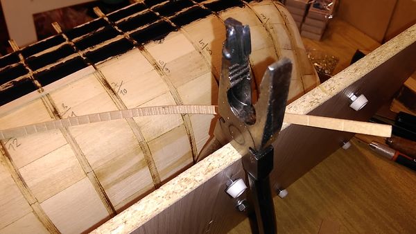 • рейки черновой обшивки я решил никоим образом ни мочить, ни вымачивать, ни выпаривать и не нагревать. Для придания рейкам формы изгибов бортов модели я решил использовать только инструмент для сгибания реек, подсекающий волокна древесины со стороны внутренней поверхности реек;