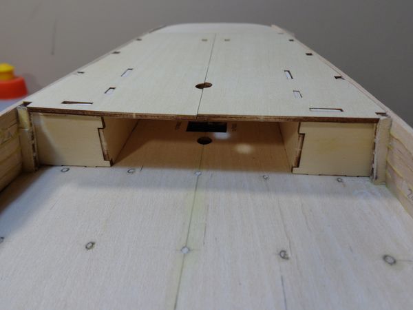 Вклеил кусочки фанеры 6 мм по всей длине палуб гон-дека, мидель-дека и опер-дека. Вклеил кусочки липы в зоне кормы с обеих сторон с целью закрытия внутренних полостей корпуса. Обрезал предварительно все вставки из фанеры и липы.
