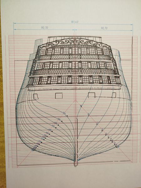 В первую очередь решил проверить соответствие форм корпуса модели настоящему кораблю. Из книги Г. А. Гребенщиковой взял проекции корпуса теоретического чертежа корабля (вид сбоку, сечения по горизонтали и сечения по шпангоутам), перевёл их в формат *.dwg и привёл их к масштабу 1:100.