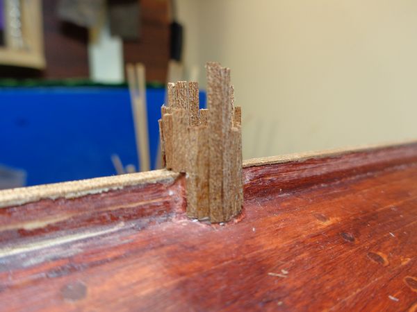 Наклеил на нижние поверхности и на боковые поверхности шкантов узкие полоски шпона сапеле встык.