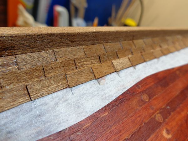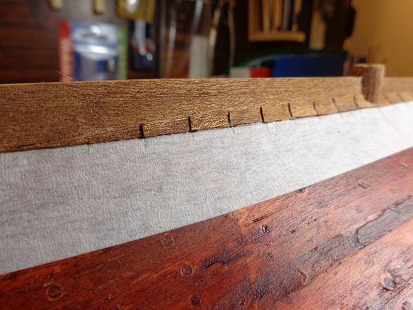 Для обеспечения укладки двух рядов обшивки сразу ниже ватерлинии — наклеил полоску малярной липкой ленты шириной 9 мм сразу под рейкой 1х1 мм, расположенной по ватерлинии, и все укладываемые в рядах кусочки сапеле обрезал по кромке этой полоски.