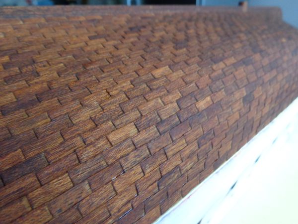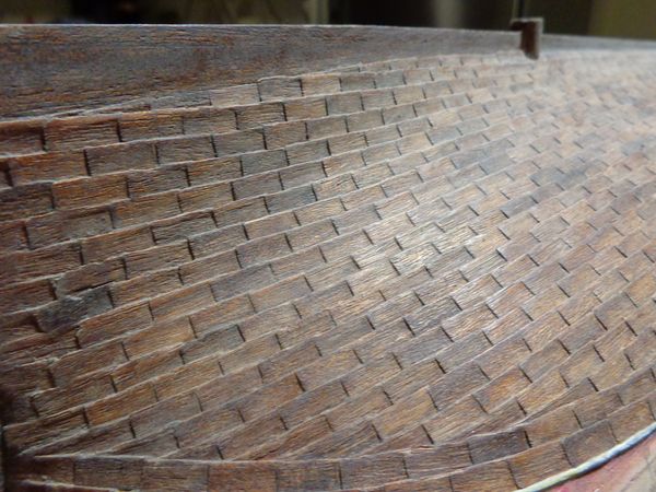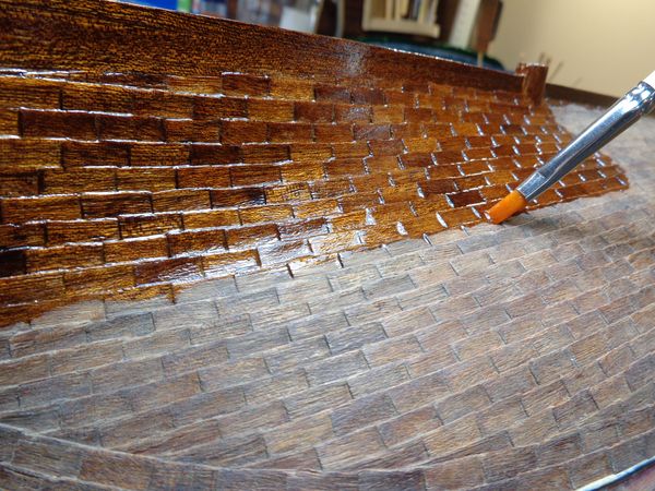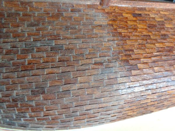 1. Обшивка днища модели кусочками шпона сапеле 12х5 мм по типу “чешуя” у меня получилась, как я задумал и решил в начале 2025 года.