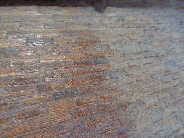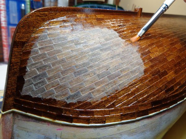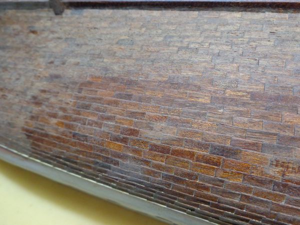 По итогу работы над обшивкой днища модели кусочками шпона сапеле 12х5 мм по типу “чешуя”, перекрывая кусочки обшивки и в ряду, и между рядами на величину ~ 0,5 мм, чтобы не подгонять кусочки шпона, и последующим покрытием шпона тунговым маслом — считаю необходимым обозначить несколько пунктов.