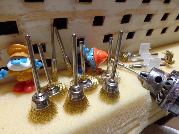 Решил обработать всю поверхность, покрытую тунговым маслом, щётками-крацовками для придания однородного вида. Такие щётки используются в гравёрных работах и в основном используются три вида щёток: чашечная диаметром ~ 20 мм, концевая диаметром ~ 7 мм и дисковая диаметром ~ 25 мм.