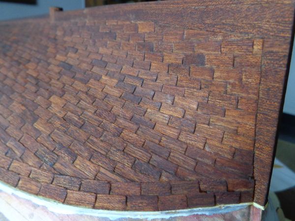С этой целью несколько последующих рядов чистовой обшивки я выкладывал косыми рейками, особенно со стороны носа и кормы, и уже к пушечным портам гон-дека я вывел линию обшивки более-менее параллельную нижнему краю этих пушечных портов.