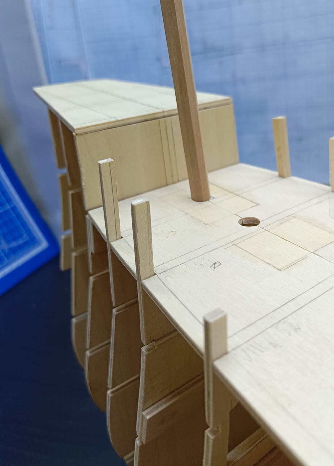 Чуть ранее я рассказывал, про шпангоут, что проходить на уровне с грот-мачтой. Пришлось думать как пропускать её через бимс...