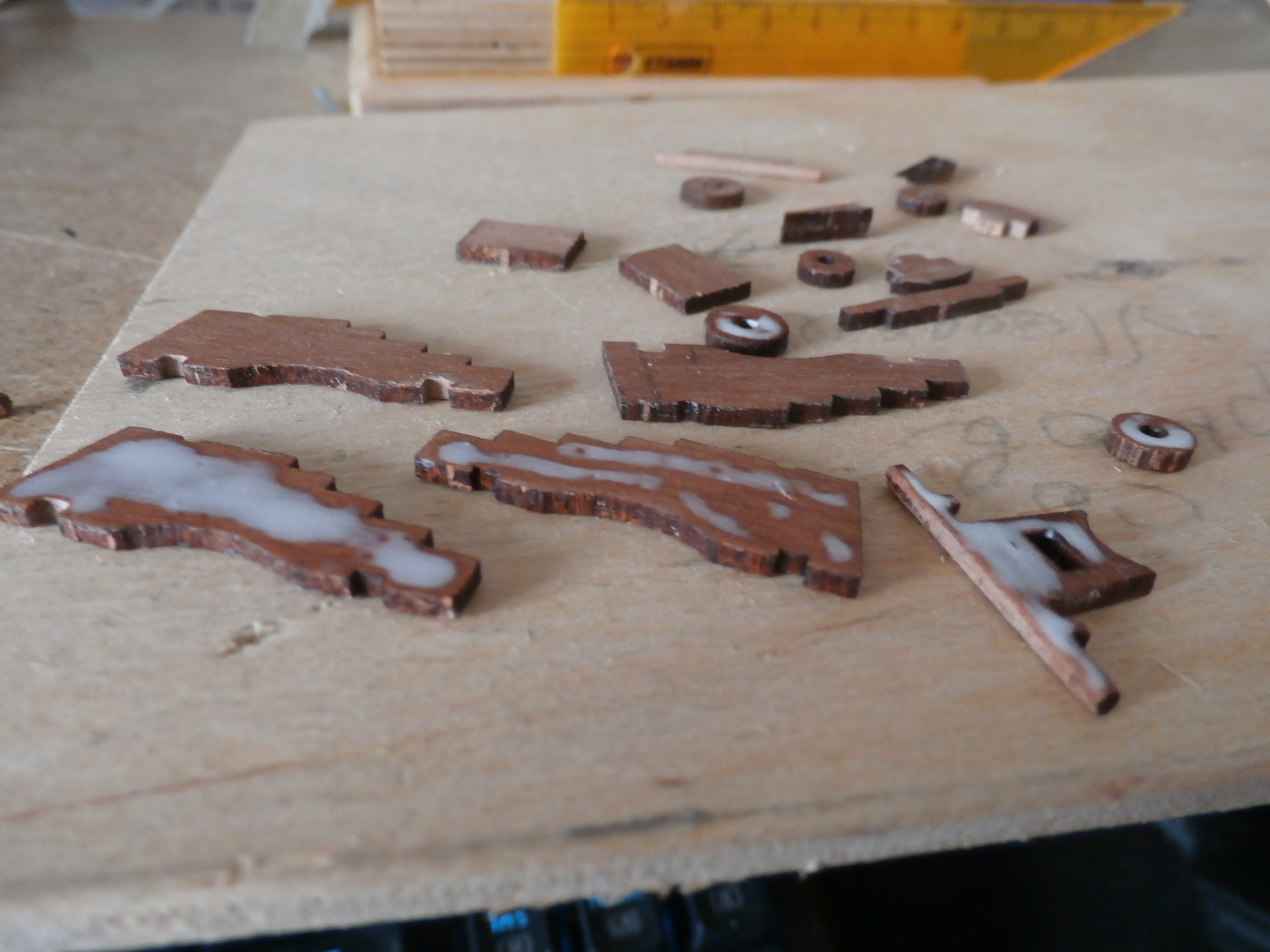 В принципе я рад, что вы не забросили своё увлечение и намерены дальше строить свои корабли. Это не сомненно хорошо! По вашей фотографии, как я понимаю, у вас большой дефицит в колёсах станков корабельной артиллерии. Я думаю они - колеса сломались, когда вы вырезали их их материнской платы! Здесь нужно знать не большой секрет мастера - судомоделиста, когда вырезаешь мелкие и очень хрупкие детали из пересушенного шпона. Первое: