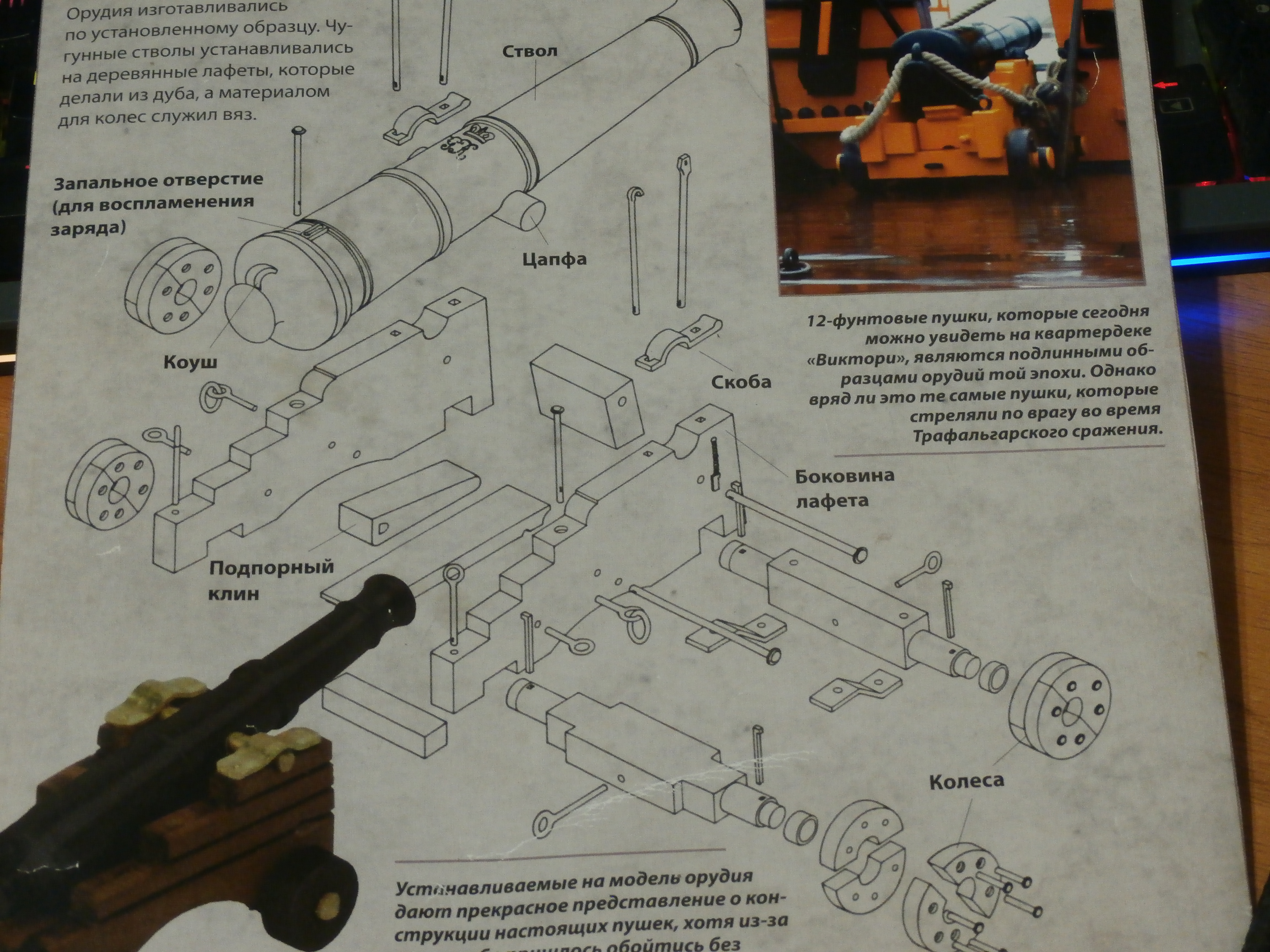 журнала "Корабль адмирала Нельсона "Виктори" из патворка ДеА. Само орудие, вернее ствол пушки я чернить не буду. Всем давно известно, что Пётр забирал из церквей и монастырей колокола и переливал их в пушки! Латунные же пушки будут достойным украшением моей модели...