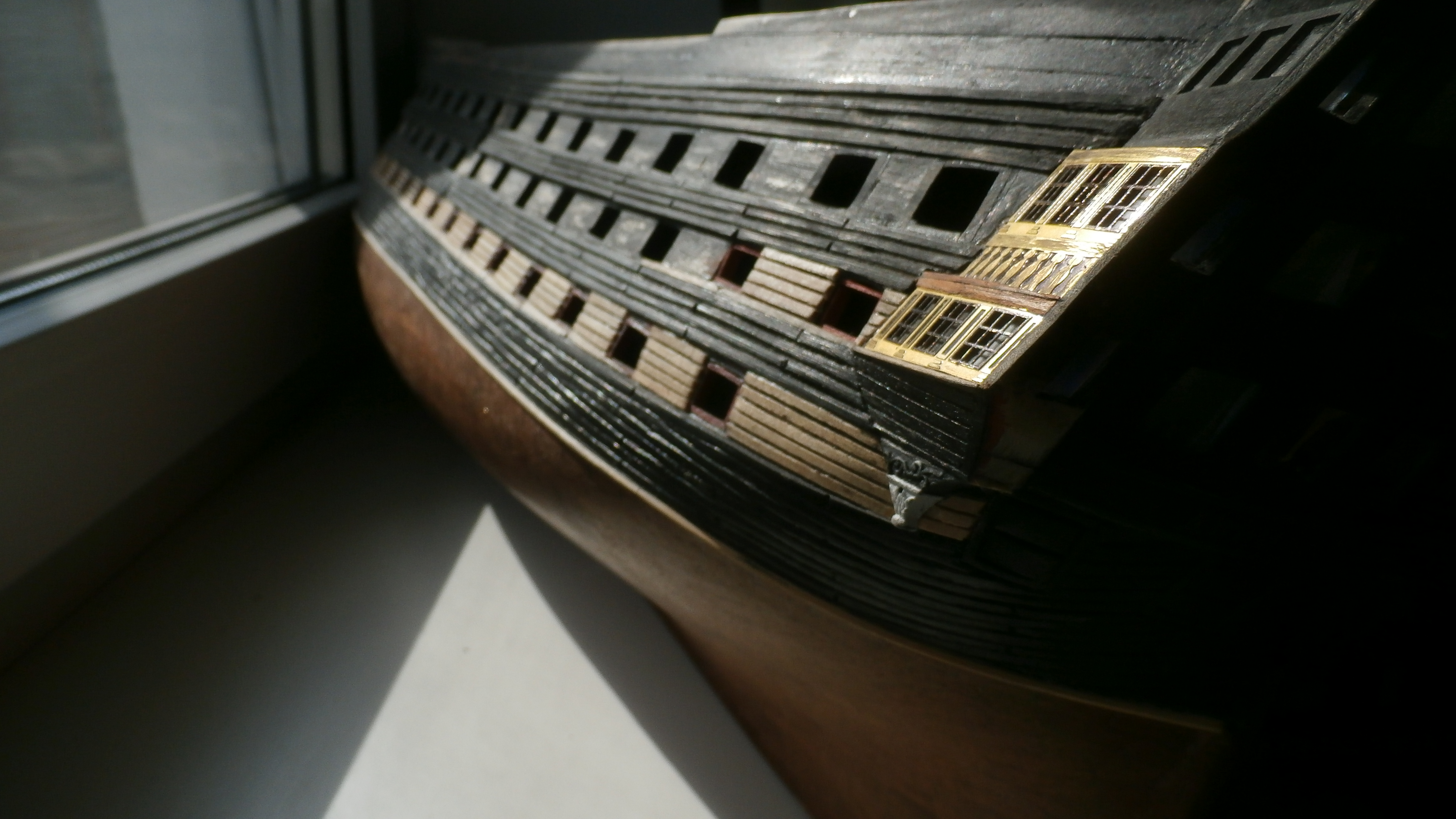 Предлагаемый “ДЕАГОСТИНИ” метод оформления пушечных портов квартер-дека не приемлем, т.к. прорезку окон пушечных портов следует выполнить практически прецизионно: нижняя и верхняя стенки должны быть строго горизонтально, а боковые — строго перпендикулярно этим стенкам. При этом надо выдержать размеры окон. Чтобы потом по этим поверхностям вклеить в окна рамки портов. Я думаю — даже опытным моделистам это не под силу.