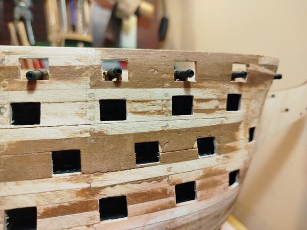 Я не совсем понял. Вы уже настелили верхнюю палубу? Если нет то учтите пожалуйста, что при настилке палубы слой клея и планок чуть приподнимут орудие в амбразуре порта...