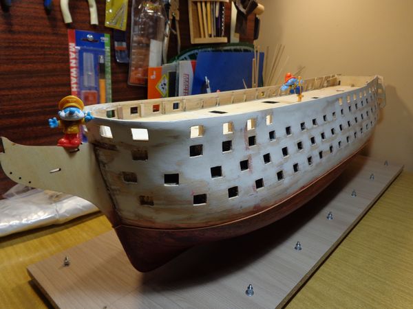 После исправления положения пушечных портов квартер-дека несколько раз наложил минимальные слои шпатлёвки в местах исправления с последующей шлифовкой наружных поверхностей корпуса модели.