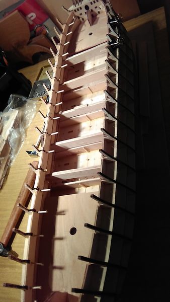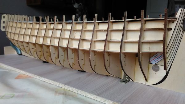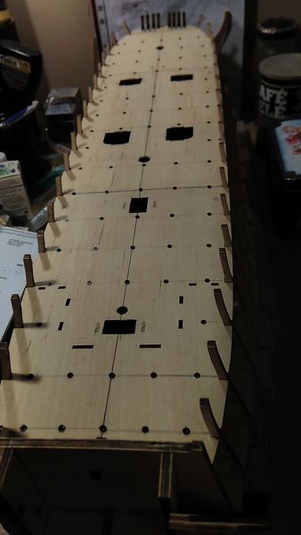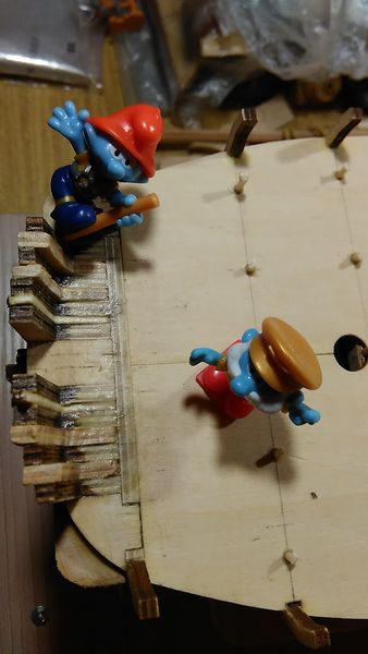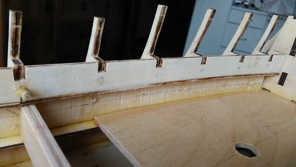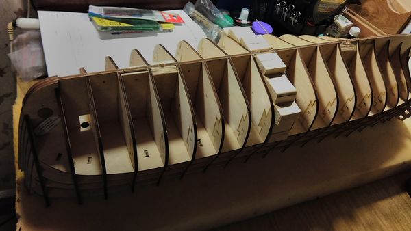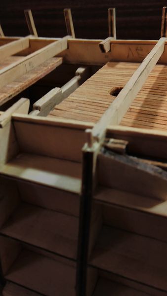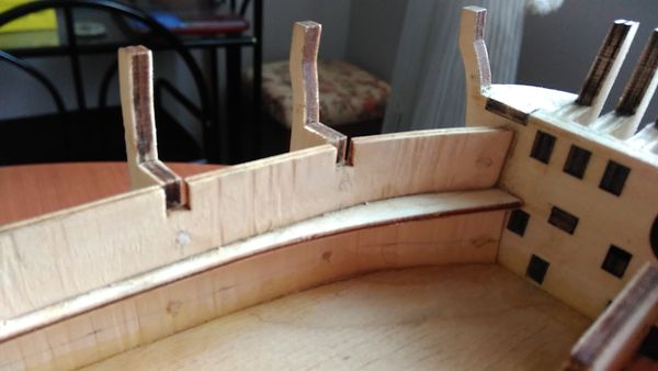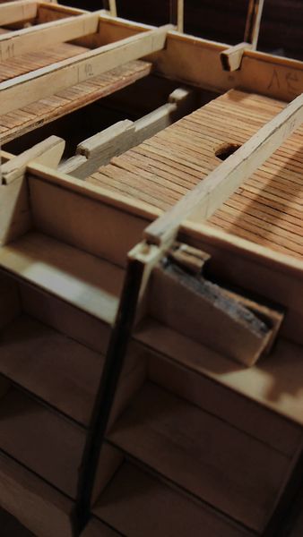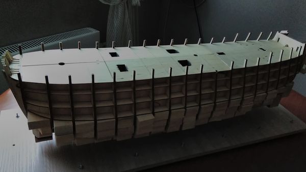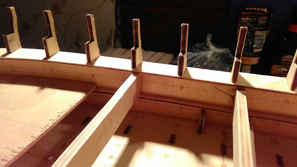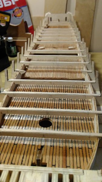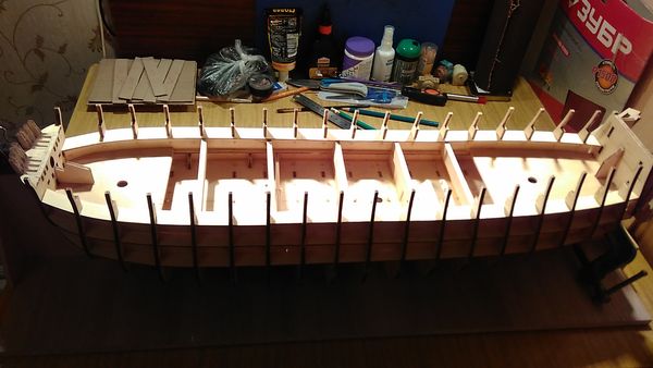 Следующий этап — приклеивание опор палубы квартердека и также, как и в предыдущих этапах, — обеспечение безусловного предотвращения отрыва опор палубы от шпангоутов, а также придания жёсткости корпусу модели.