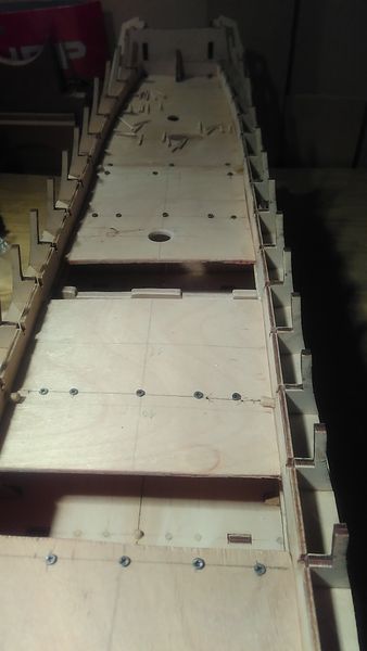 • усилить кусочками фанеры палубы гон-дека, мидель-дека и опер-дека в зонах примыкания к внешней обшивке с целью увеличения жёсткости корпуса, обеспечения лучших условий при укладке обшивки по криволинейным поверхностям корпуса, а также обеспечения приемлемых условий при закреплении внешнего оснащения (наружных трапов, крамболов, якорей, русленей и др.).