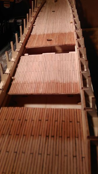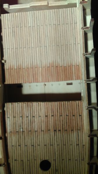При установке палубы квартердека я решил исключить имитацию двух сходных люков, расположенных по оси модели: некоторые сложности с их установкой, могут опять отвалиться и потом опять ищи-свищи их внутри корпуса модели, и другие неожиданности. Решил, что тренировочный настил палубы опер-дека будет выполнять роль настоящей палубы при взгляде в проёмы этих сходных люков.