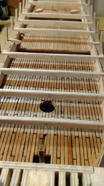 Перед этапом обрезки и выравнивания заполненных шпаций решил закрыть корпус модели сверху, уложив окончательно палубу квартердека. Это позволит максимально исключить попадание деревянной стружки и другого мусора внутрь корпуса модели.