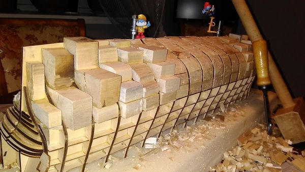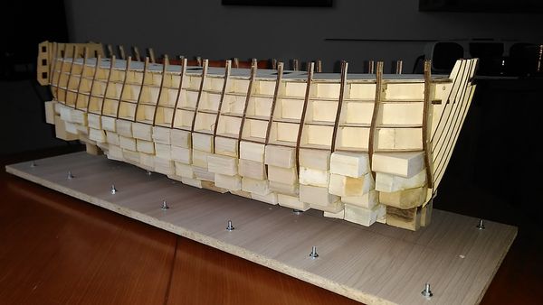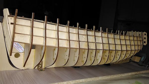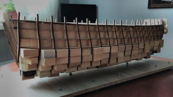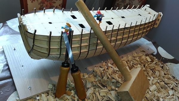 Сборка модели продолжилась заполнением промежутков между формообразующими вставками на носу и на корме — с целью обеспечения монолитности корпуса, а также обеспечения возможности крепления черновой обшивки, сначала миниатюрными шурупами, а после высыхания клея — штифтами из зубочисток.