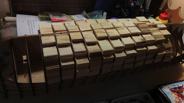 а вот окончание процесса заполнения шпаций. Верхняя палуба уложена без закрепления.