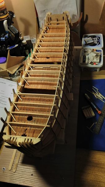 Т.к. я заполнил шпации ниже гон-дека, заполнил промежутки между формообразующими вставками на носу и на корме, я также решил усилить палубы в зонах примыкания орудийных портов к внешней обшивке — черновая обшивка будет уложена практически по сплошному материалу. Особенно ниже палубы гон-дека. Крепить черновую обшивку буду на клей и шурупы, а затем выверну шурупы и вставлю на их место на клей штифты из зубочисток.