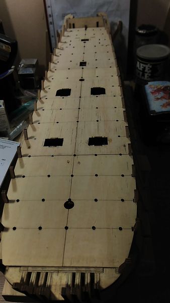 Также как и для опор палуб опер-дека и мидель-дека — для безусловного предотвращения отрыва опор палубы квартердека от шпангоутов, а также придания жёсткости корпусу модели, я вклеил палубу опер-дека, выполненную из фанеры 6 мм. Палуба получилась не сплошная, потребовалось выполнить разрывы для сходных люков и отверстия под установку мачт.