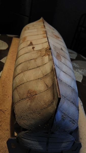 В вашем случае есть небольшая сложность сохранить точную форму шпангоута, т.е.если делать от миделя в носовую или кормовую часть корпуса то ориентир кромка шпангоута сохраняется, а в вашем случае оставить нетронутой среднюю часть сложнее, и тоже в вашем случае использование шпаклёвки которую при черновой обшивке ну как бы можно свести к минимуму.