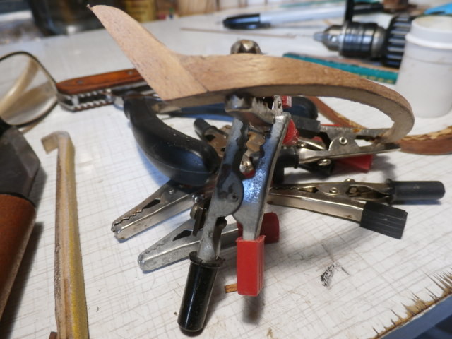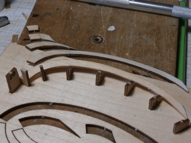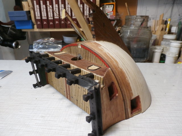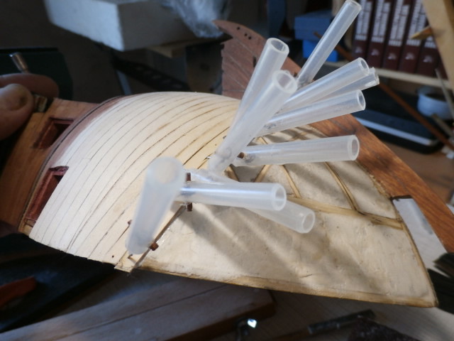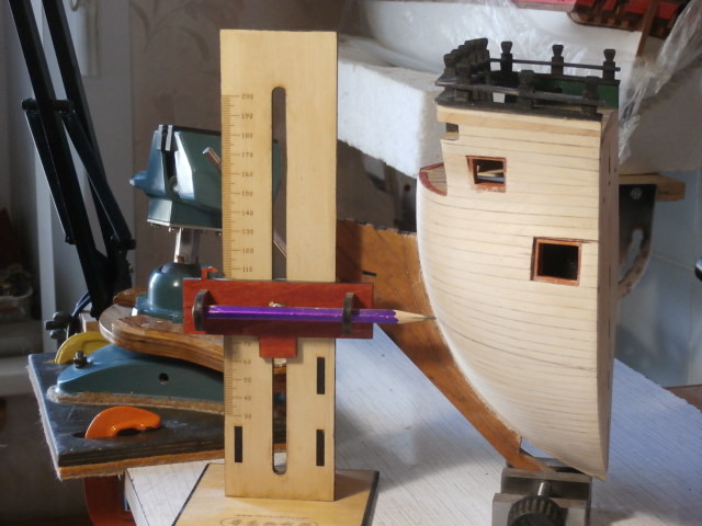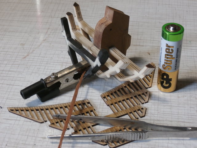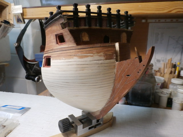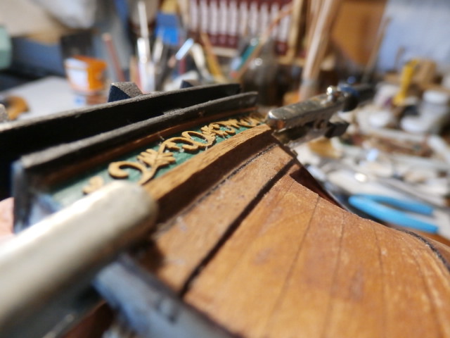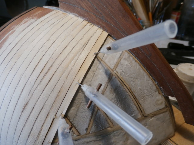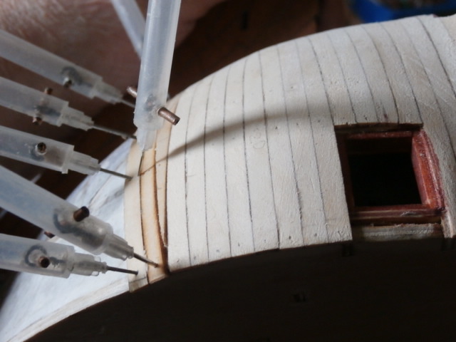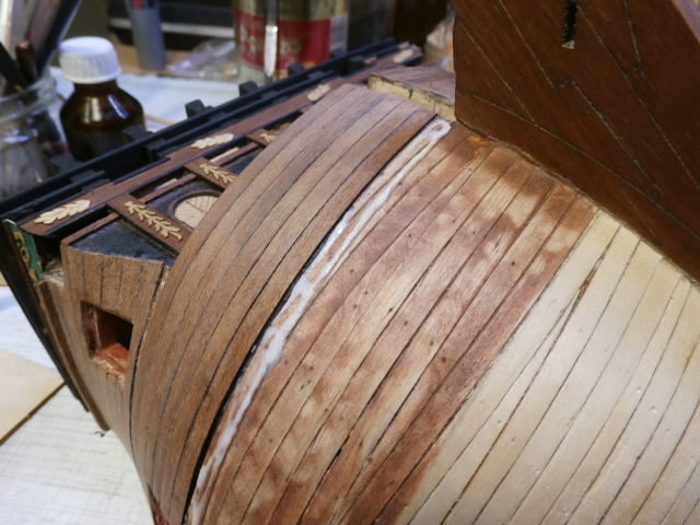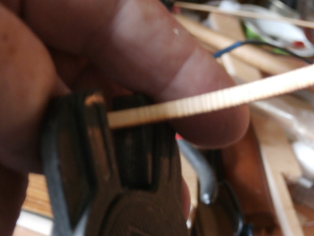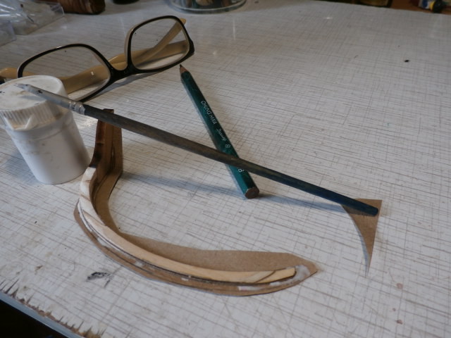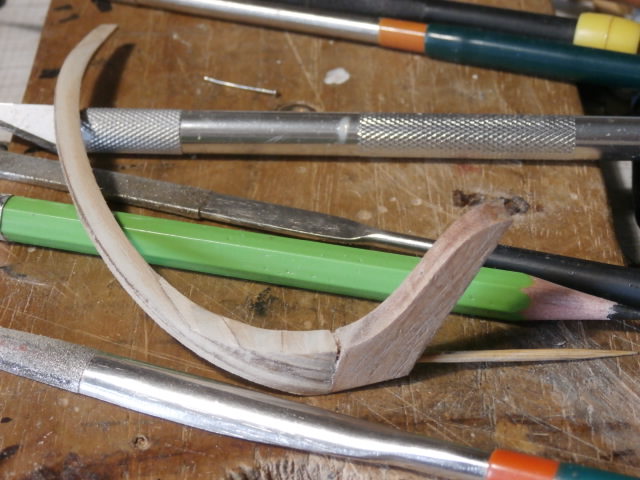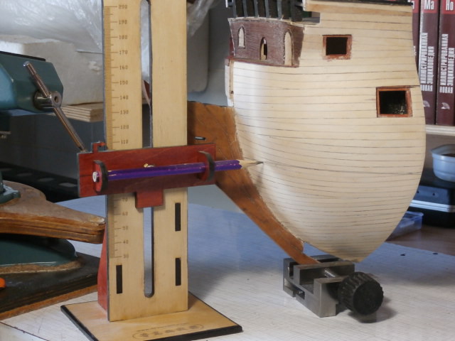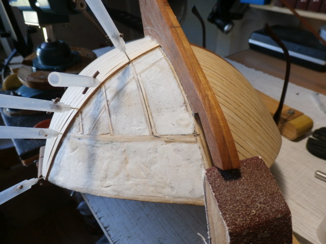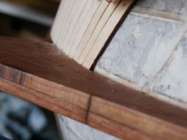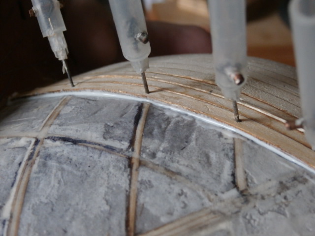 Я в какой то мере подготовился к строительству сложности корпуса. Очень помогает мне в этом штроба, которую я изготовил на волнорезе княвдигета. Доски обшивки хорошо и надежно входят в эту штробу , спокойно удерживаются там. Перед приклейкой "пробегаю" инструментом от Амати, изгибая рейки обшивки. Из за сложности корпуса модели часто приходится использовать прием "потеряев". То есть один конец из реек обшивки приходится зауживать "на нет". Работа довольно интересная, творческая.