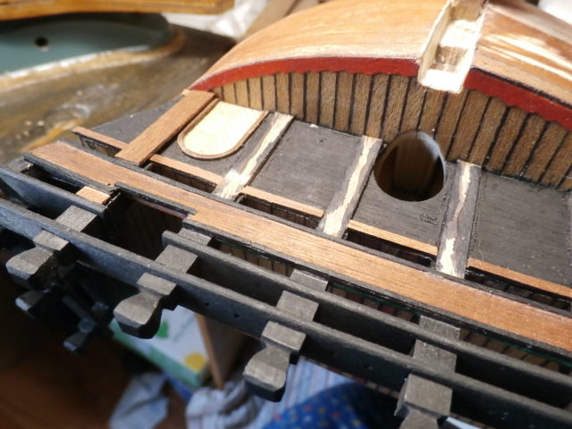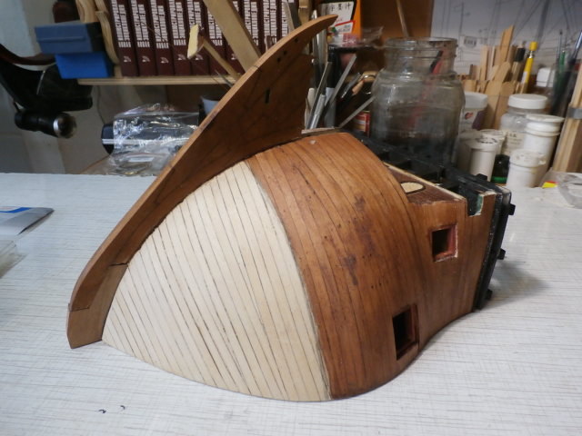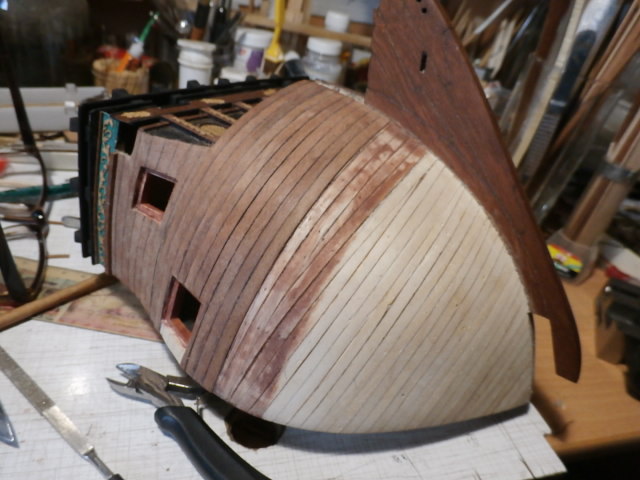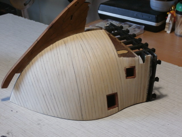 Время неумолимо катит вперед. Вперед движется постройка моей модели. Закончилась черновая обшивка носового сечения российского корабля "Ингерманланд". Жаль конечно, не знаю ни китайского языка ни мудрости китайских иероглифов. Инструкция и чертежи КИТа все на сквозь пропитаны китайской ученочностью. Мне остаётся только гадать и радоваться временами своей догадливостью и тем что я кажись топаю в правильном направлении. Я был уверен, что после черновой нужно приступать к чистовой обшивке. Но оказалось до этого нужно мне закончить Бикгед, иначе будут проблемы в укладывании реек чистовой обшивки.