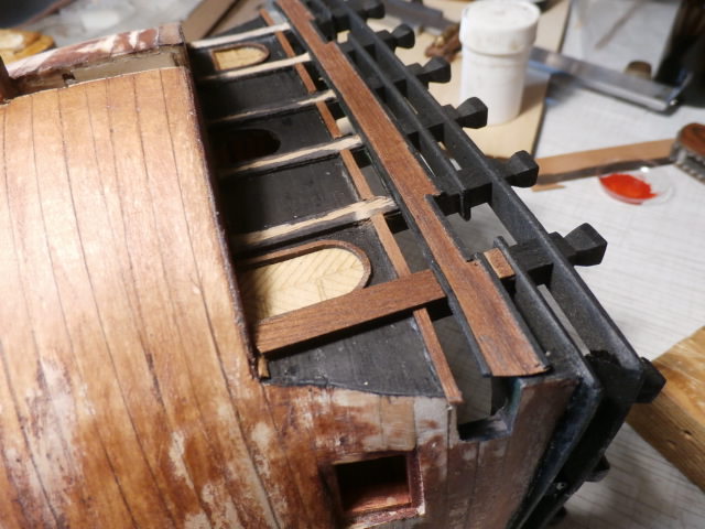 Работы по строительству модели носового сечения российского линейного корабля "Ингерманланд" продолжаются. Накопились фото и я решил поделиться ими с вами. _Чистовая обшивка модели_ Чистовую обшивку модели я провожу планками китайской вишни. Материал по качеству мне нравится. 0,5 Х 5 Х 450 мм. Толщина рейки не много гуляет, но это не критично, после обточки, я думаю будет не заметно. Цвет, же прекрасен! Темно коричневый, с красноватым отливом, после обточки, добавляется чуть сероватый - пепельный налет, всё это убедительно визуально показывает на добротные корабельные доски! Качество чистовой обшивки модели зависит конечно прежде всего от качества и подгонки липовых планок на черновой обшивке. Мнение того что планки чистовой обшивки с верху закроют любые огрехи черновой обшивки - здесь не прокатят! Я не сторонник склеивать планки чистовой обшивки в сплошной массив. По моему мнению на любой модели доски обшивки борта корабля должны выделяться друг от друга. Тем паче крупный масштаб - 1 : 50. Для того чтобы между наружными досками не заметно было внутренние доски, я их заморил спиртовой морилкой. Для того, чтобы визуально выделить доски обшивки между собой, каждую реечку , её грани выделяю черным маркером. Маркер должен обязательно быть быть - перманентным и при открытии колпачка пахнуть спиртом! Иначе вместо красоты добавите в свою модель только грязи!