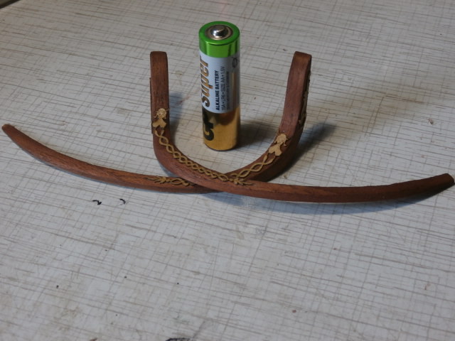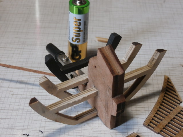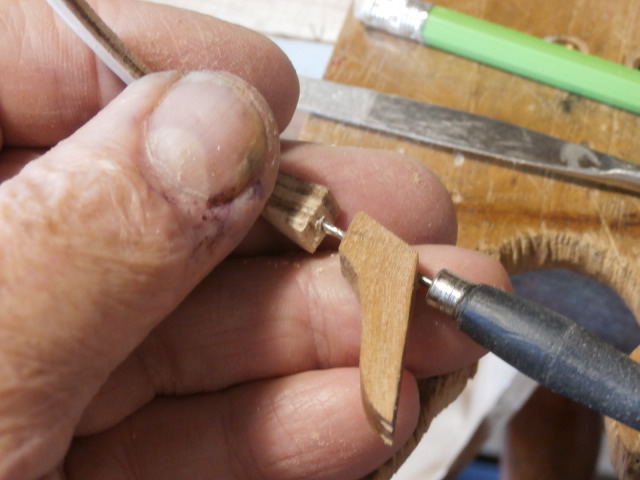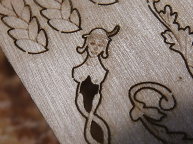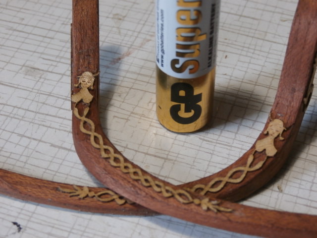 Производитель предлагает сильно не заморачиваться и после сборки на стапеле эту кницу просто покрасить в черный цвет и по верх наклеить орнамент. Но я пошел дальше и после склейки и обточки кницы её оклеить тонким шпоном (0,5 мм) и только потом уже оформлять ее растительным орнаментом. Вот что из этого вышло: