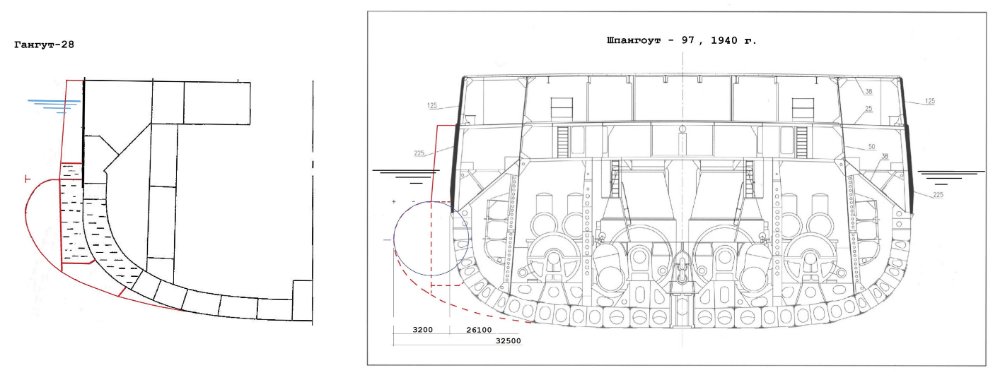 и по ранее приводимым чертежам разрезов, "наполнение" противоторпедных булей надо будет доводить до проекций первых приложенных к корпусу наборных элементов.