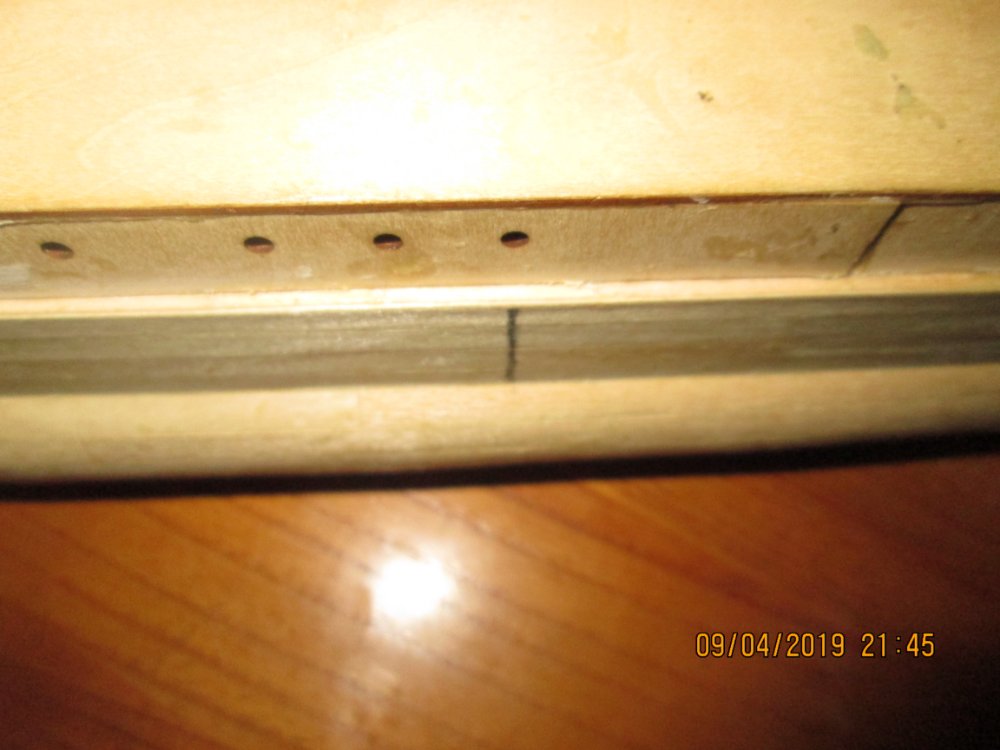 И так насчет булей. Спасибо Алексей за ответ.С габаритами булей в боковой проекции понятно (чертеж есть). Теперь начинается самое интересное. Алексей, вы выше на форуме говорили, о том что були надо не стачивать, а наоборот наполнять. Сначала я не придал этим словам значения. Теперь, взглянул на чертежи, посчитал размеры в масштабе и у меня получился размер "полки" ( у вас выше отмечена синей стрелкой) равный 1 метр. В нашем масштабе 5 мм. Отметил на модели 70-й шпангоут (черная полоска на фото) а там размер 2 мм. Исправление косяка издателя вижу в следующим: наклеить рейку от черновой обшивки и одну от чистовой. Размер получим 4,5-5 мм. Жду комментариев. Фото ниже