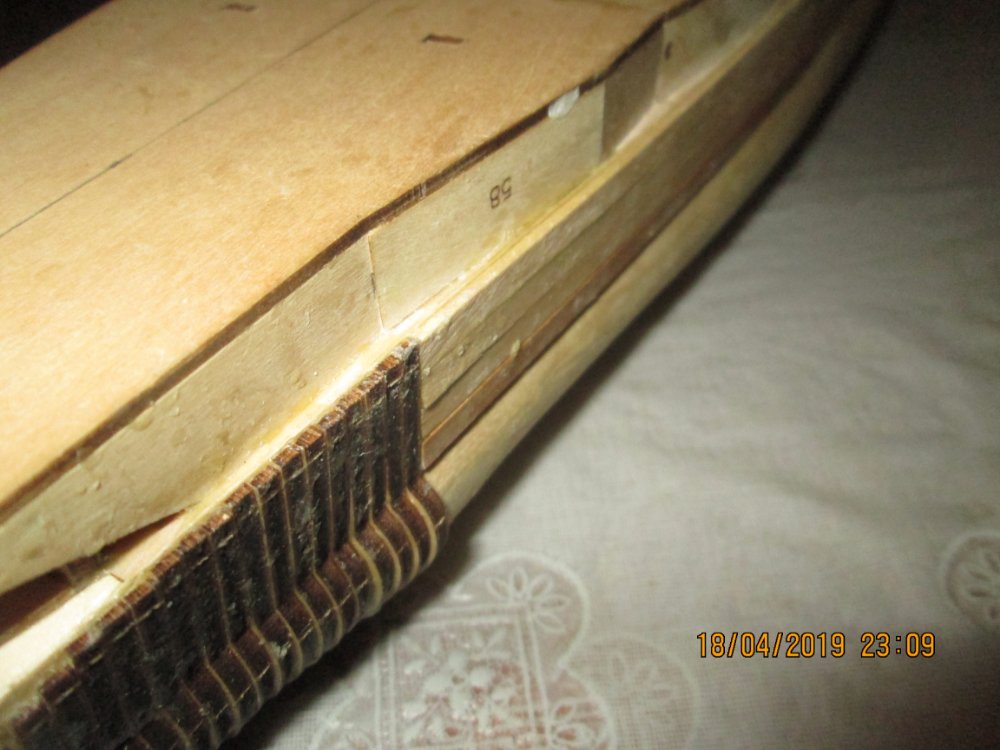 Здравствуйте! Ну вот и появилась инструкция по сборки (№74), где издатель ответил на все вопросы по сборки корпуса ( я так и предполагал): никаких накладок на борта для увеличения ширины не будет! Сделал первый шаг для приближения к реальным размерам. Как писал раньше, наклеил дополнительные рейки черновой обшивки на борта под казематами (кстати рейки легли "как тут и были" между деталями оконечностей булей, не надо кучи шпаклевки). Второй шаг: решил увеличить ширину булей ближе к реальным размерам-наклеить 4 рейки "стопочкой" (6 мм) а далее с помощью тех же реек и шпаклевки сделать новый профиль булей. Для начала решил сравнить реальный разрез корпуса корабля с разрезом корпуса модели после шага номер один (сделал шаблон). Разрезы по размерам СОВПАДАЮТ! Я думал, что неправильные размеры ширины булей ( их можно изменить), а оказалось, что общий размер ширины неправильный. Значит и ширина палубы не соответствует реальным! Сейчас уже невозможно что либо сделать. От шага номер два - отказался. И кстати: на главной страницы сайта даны размеры модели:длина-924мм, ширина- 163 мм, высота-240мм, а в магазине издателя в описании журналов: