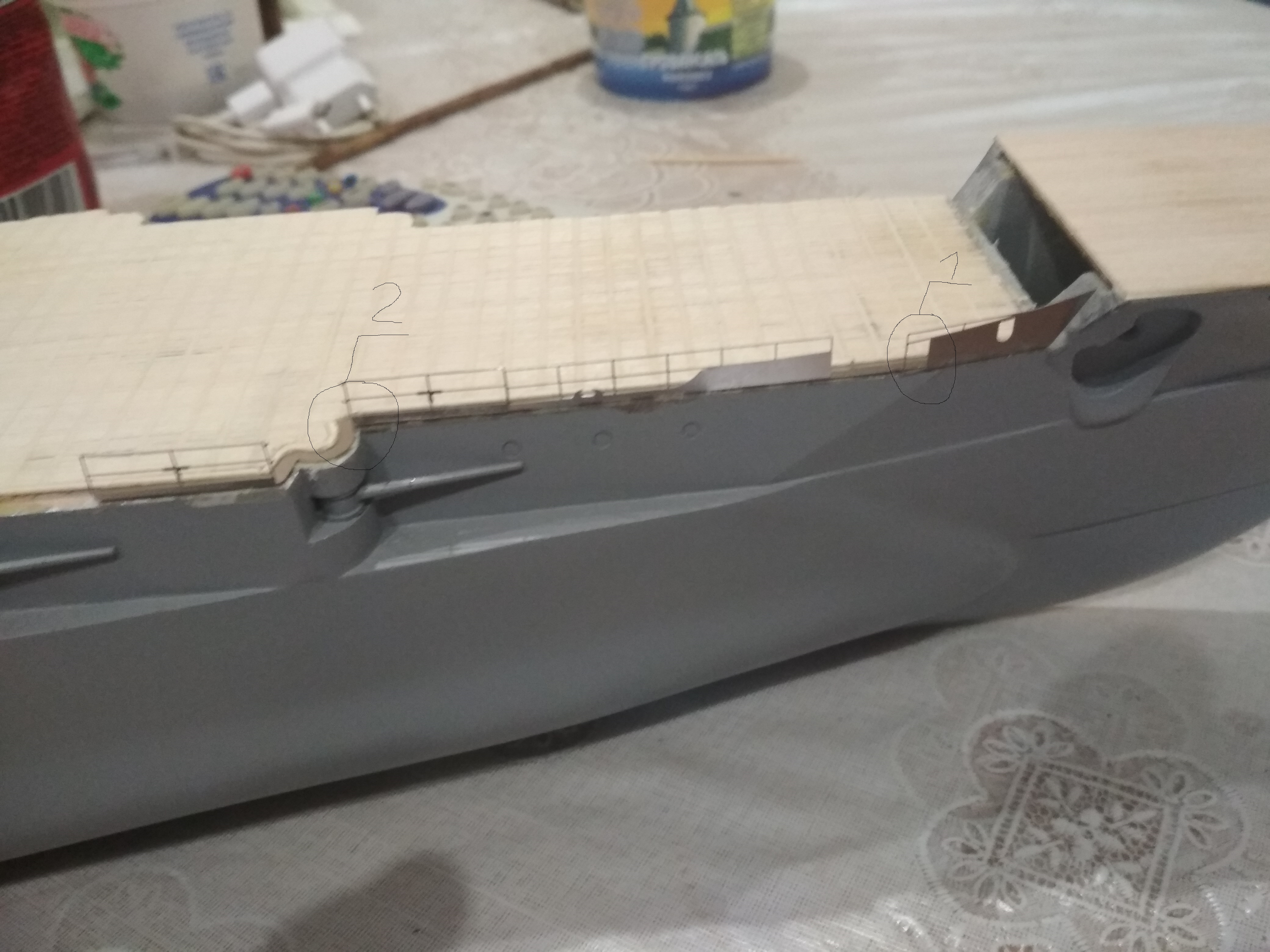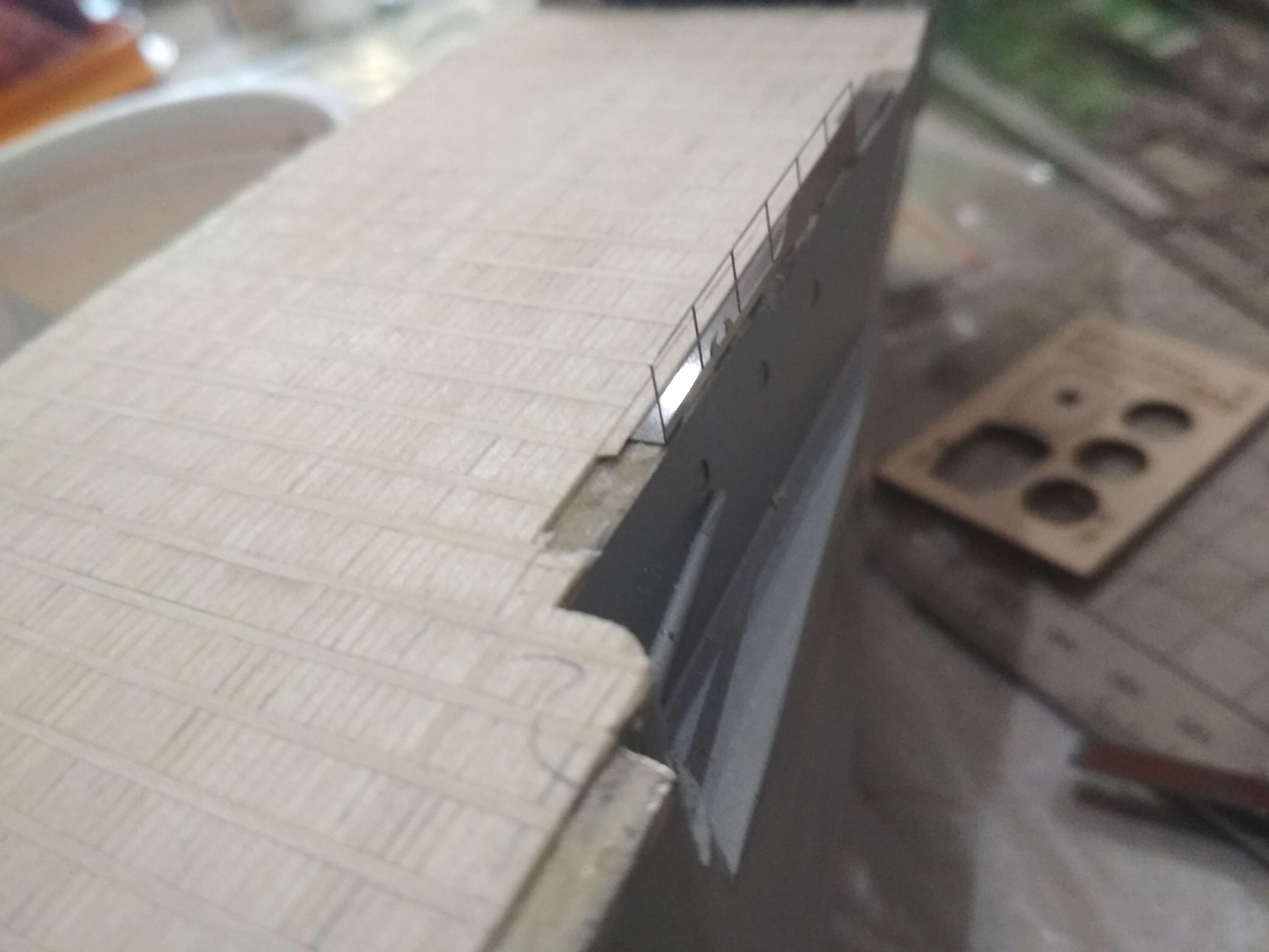Решил проверить стыковку первых элементов ватервейса ( на сухую). Стыкуются нормально. Посмотрим потом на остальные элементы. Подгонку и монтаж всего этого хозяйства буду делать перед самой покраской. Следующий этап (думаю будет трудоемкий) это обрамление всего палубного хозяйства, № 116 впереди.
