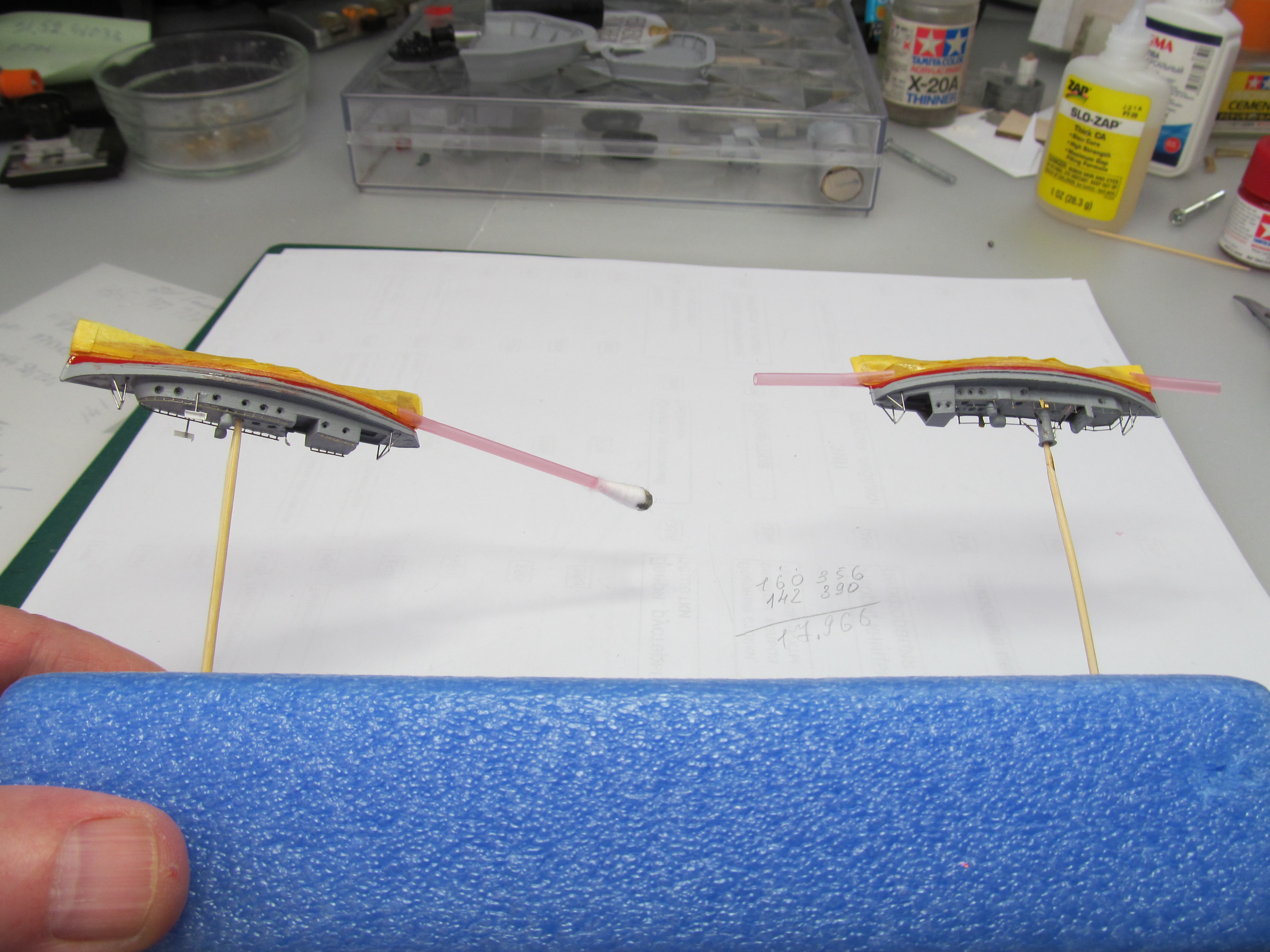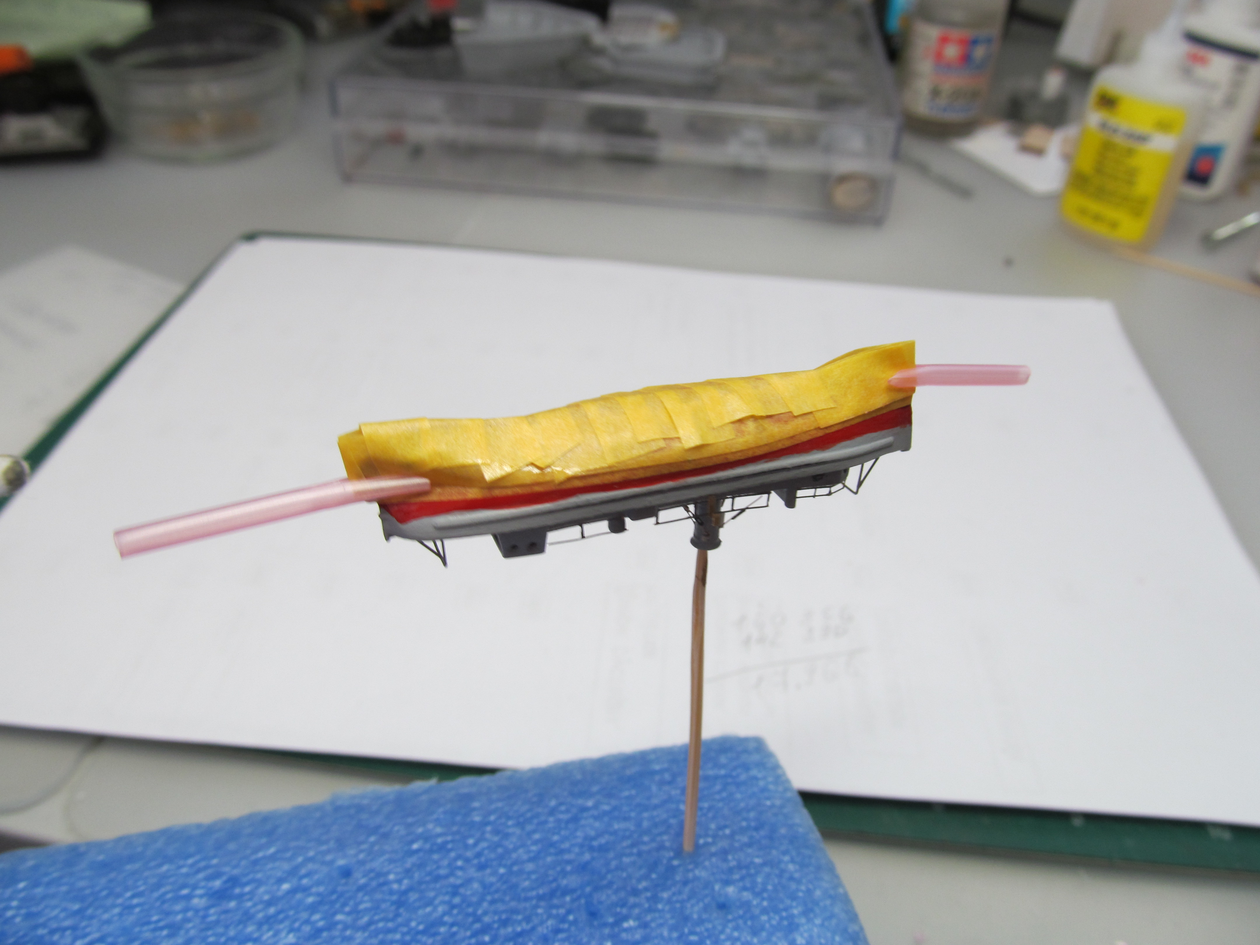 Чтобы под скотч не затекла краска....... просто сделал продольный разрез в палочке типа "ласточкин хвост" и надел на корпус катера.