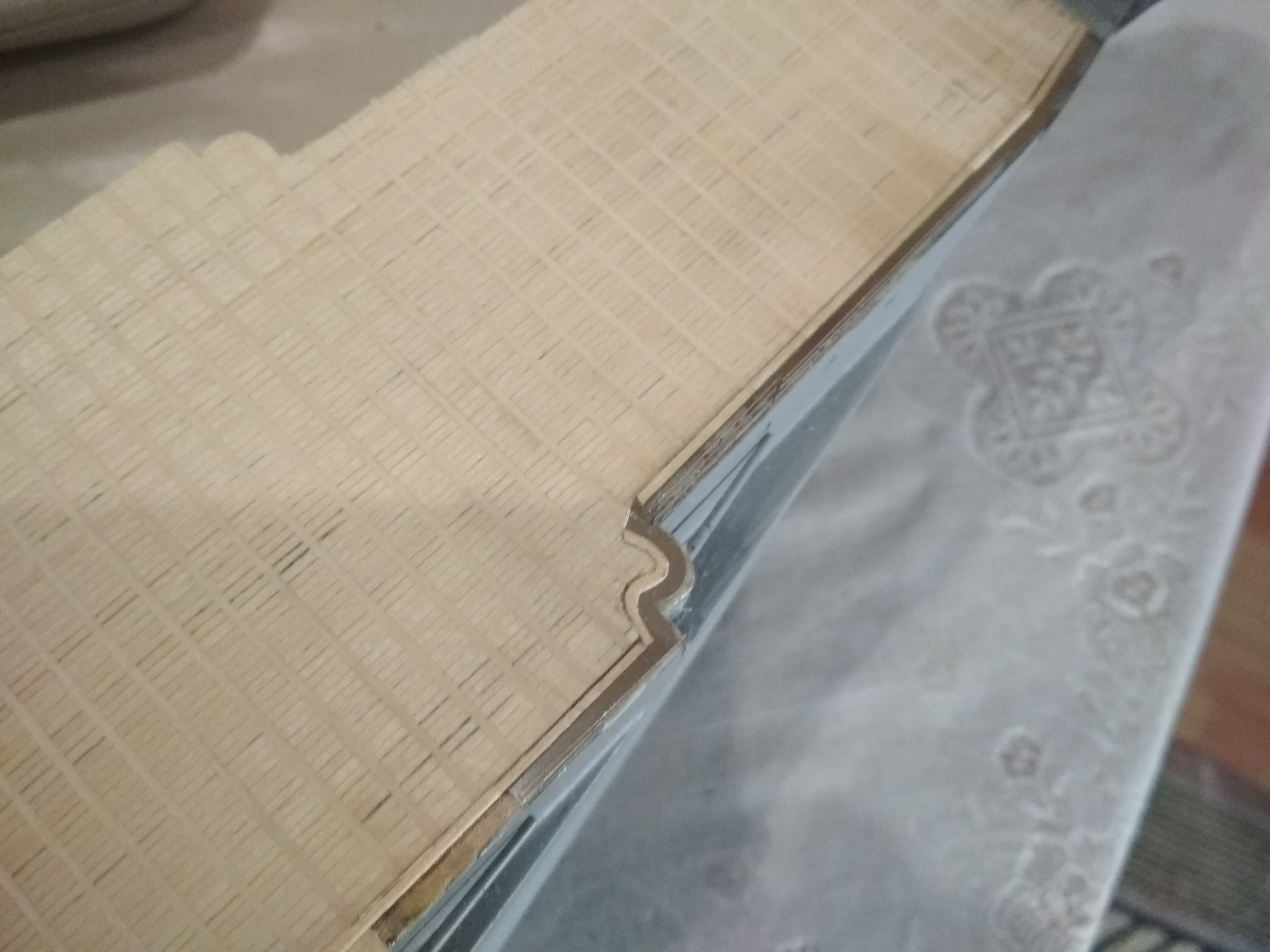 Привет. Загибулины не сгибал а вырезал из шпона шириной 5мм. В качестве лекала-ватервейс над казематами.Перед вырезанием шпон приклеил на молярный скотч ( чтобы не трескался )