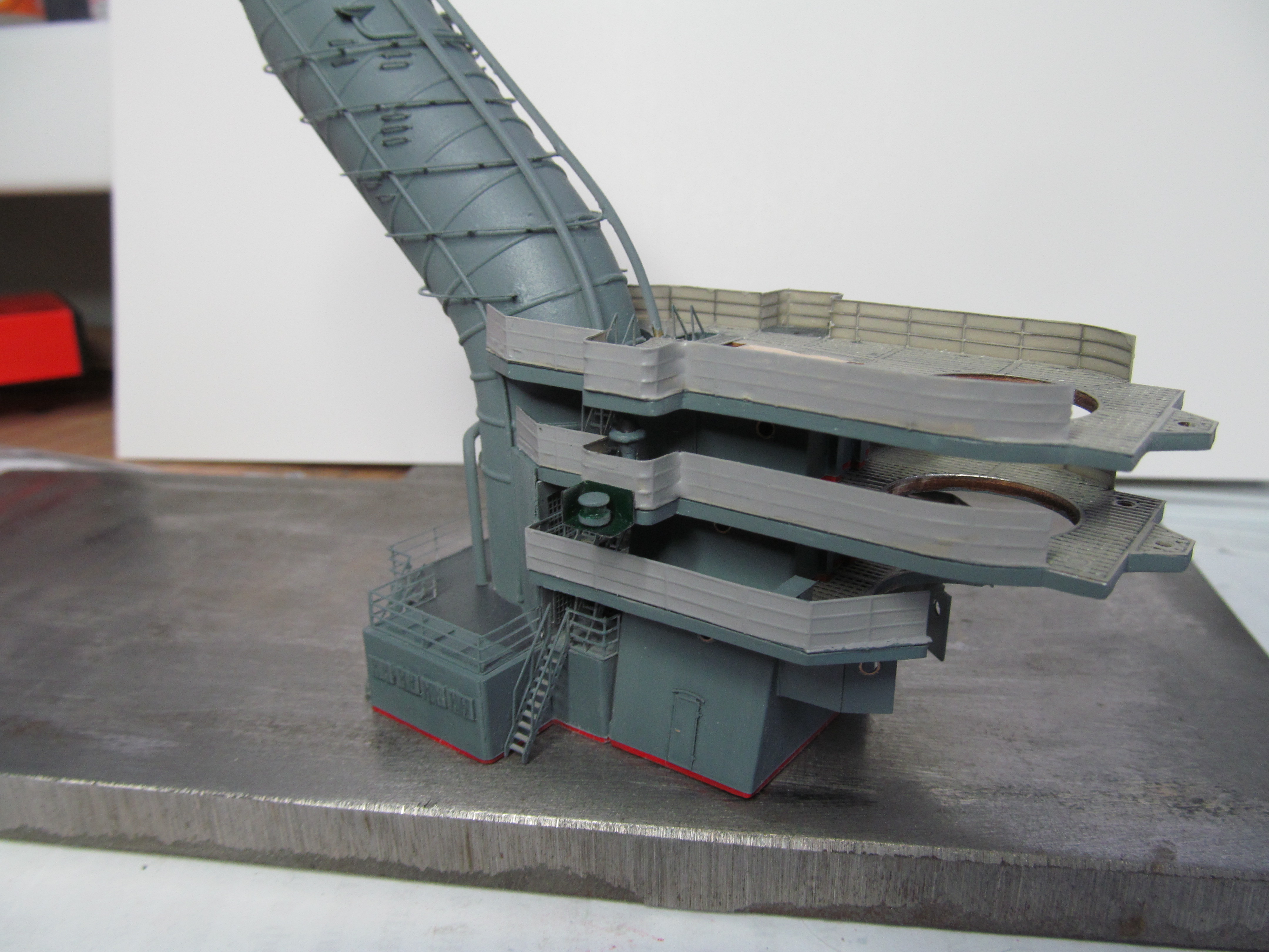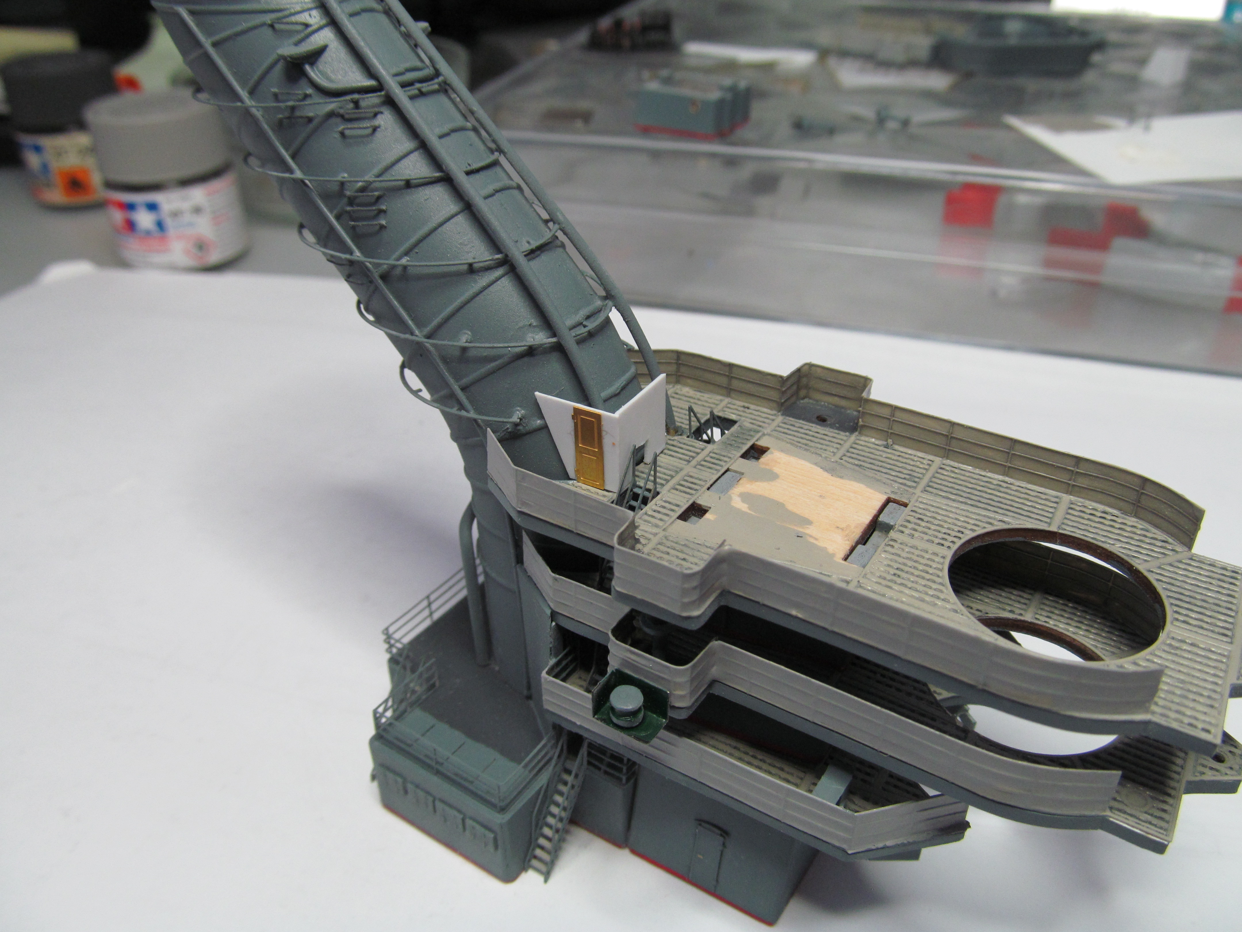 Поскольку основным определяющим стержнем, с которым ВСЕ площадки ярусов необходимо сопрягать аккуратно и без перекосов является дымовая труба, то я и начал с её установки и потом уже под неё подгонял площадки ярусов.