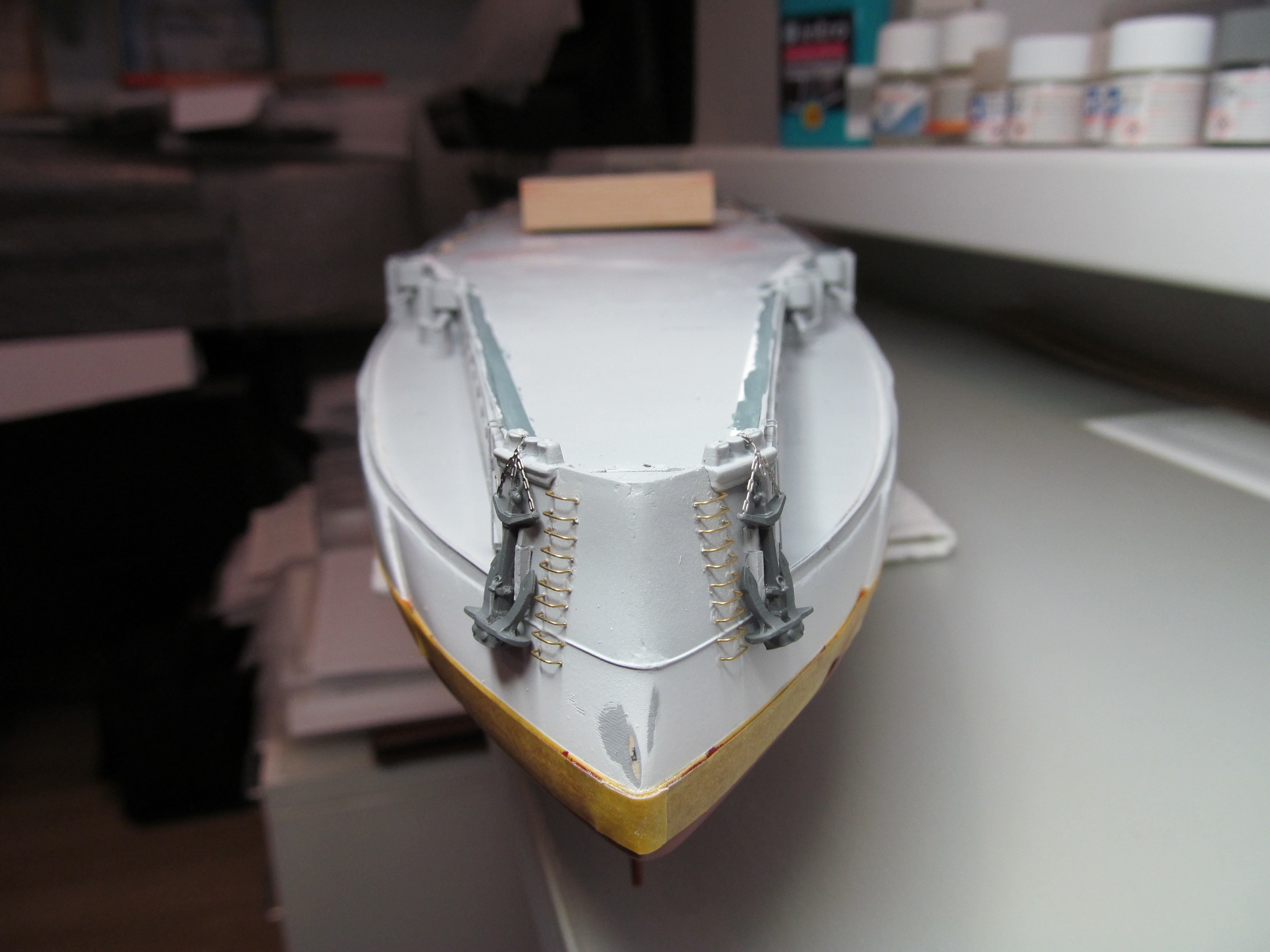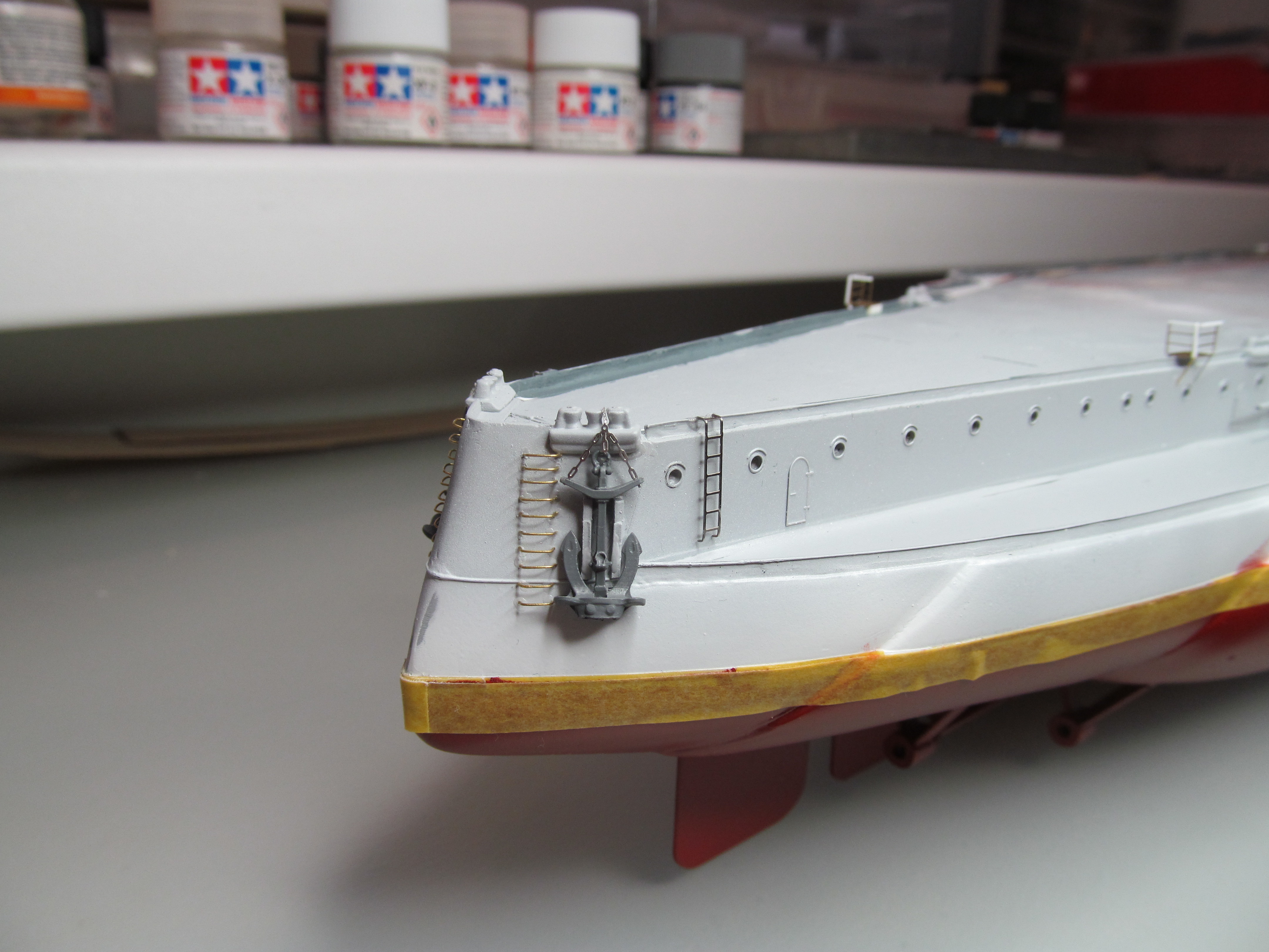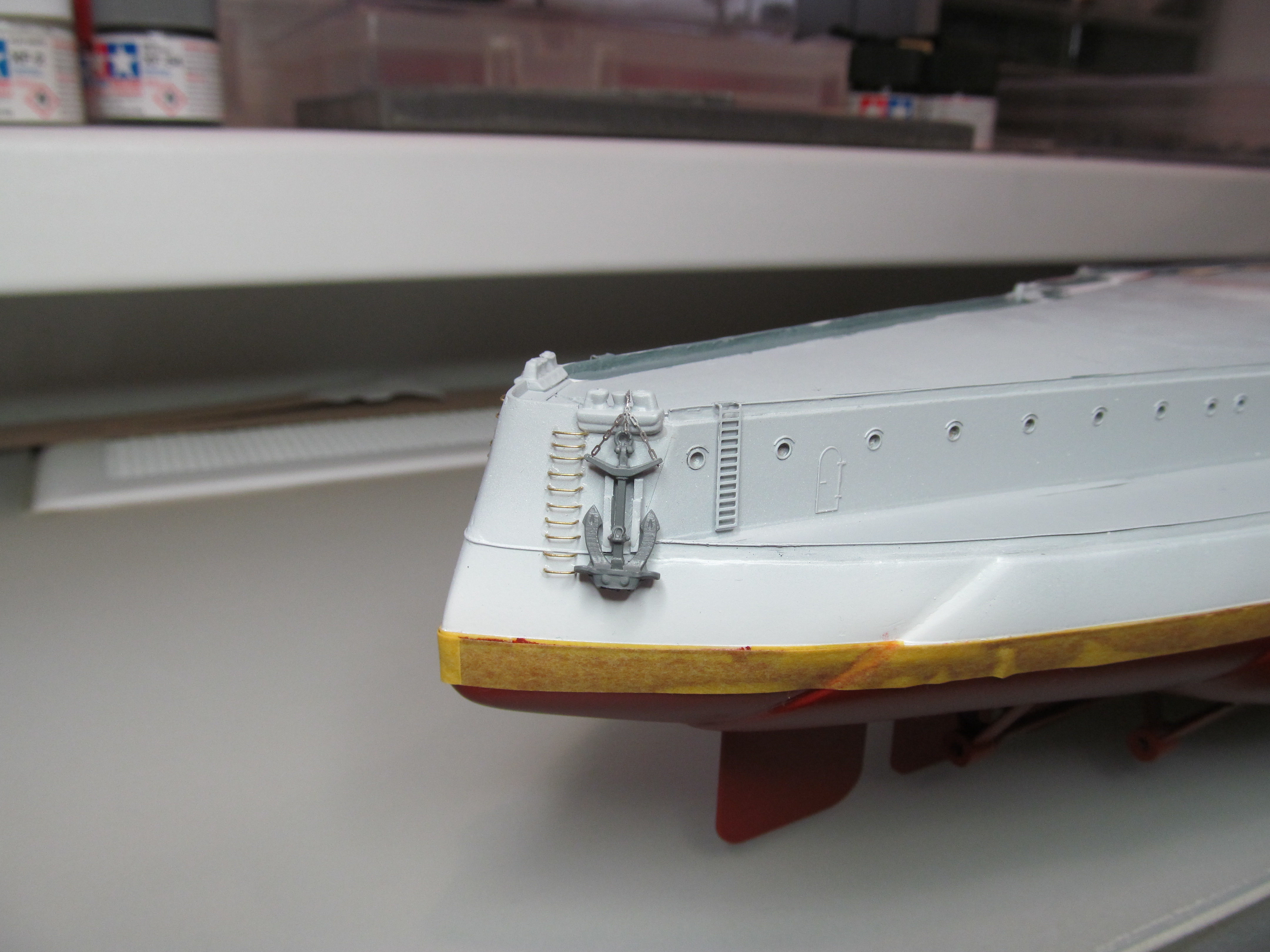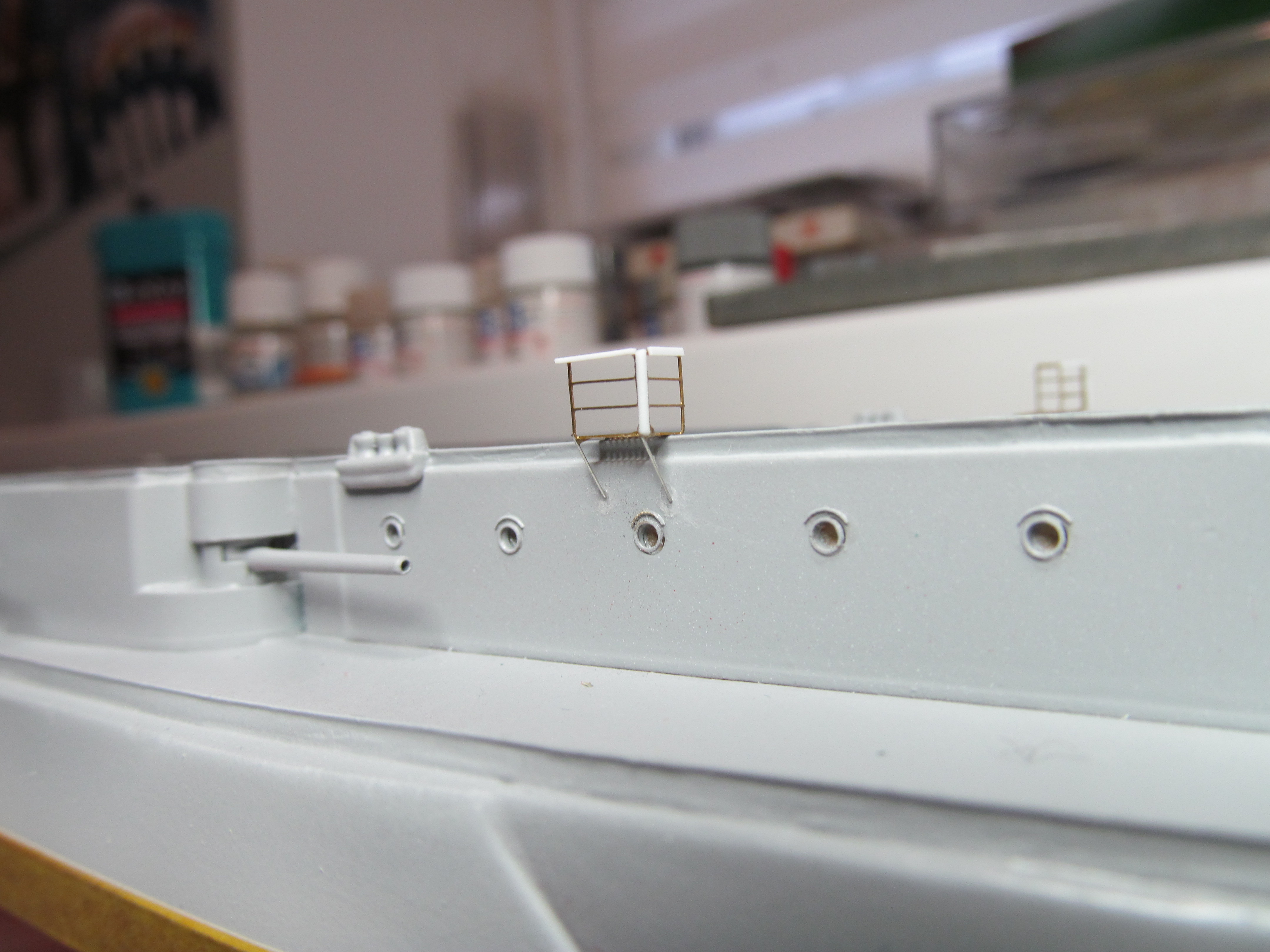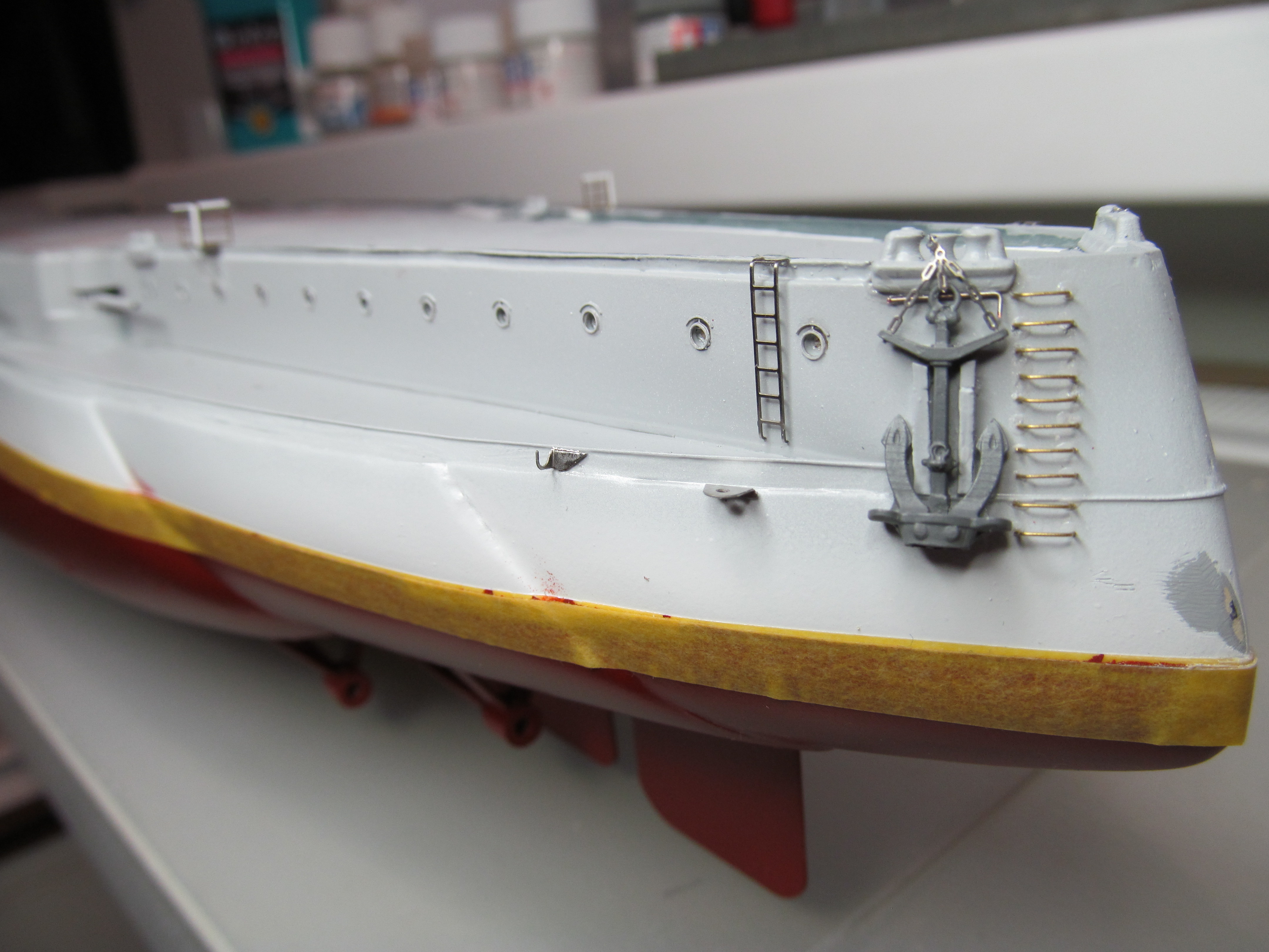 Алексей привет! Вы не переживайте. Вы не один,кто строит модель.За Вашими работами постоянно слежу. Вы молодец. По поводу темных пятен: я в том месте тренировался и это место закроется барбетом башни. Корабль планирую ставить в большую закрытую полку, где будут стоять еще модели. По поводу ограждений, спасибо, подумаю.