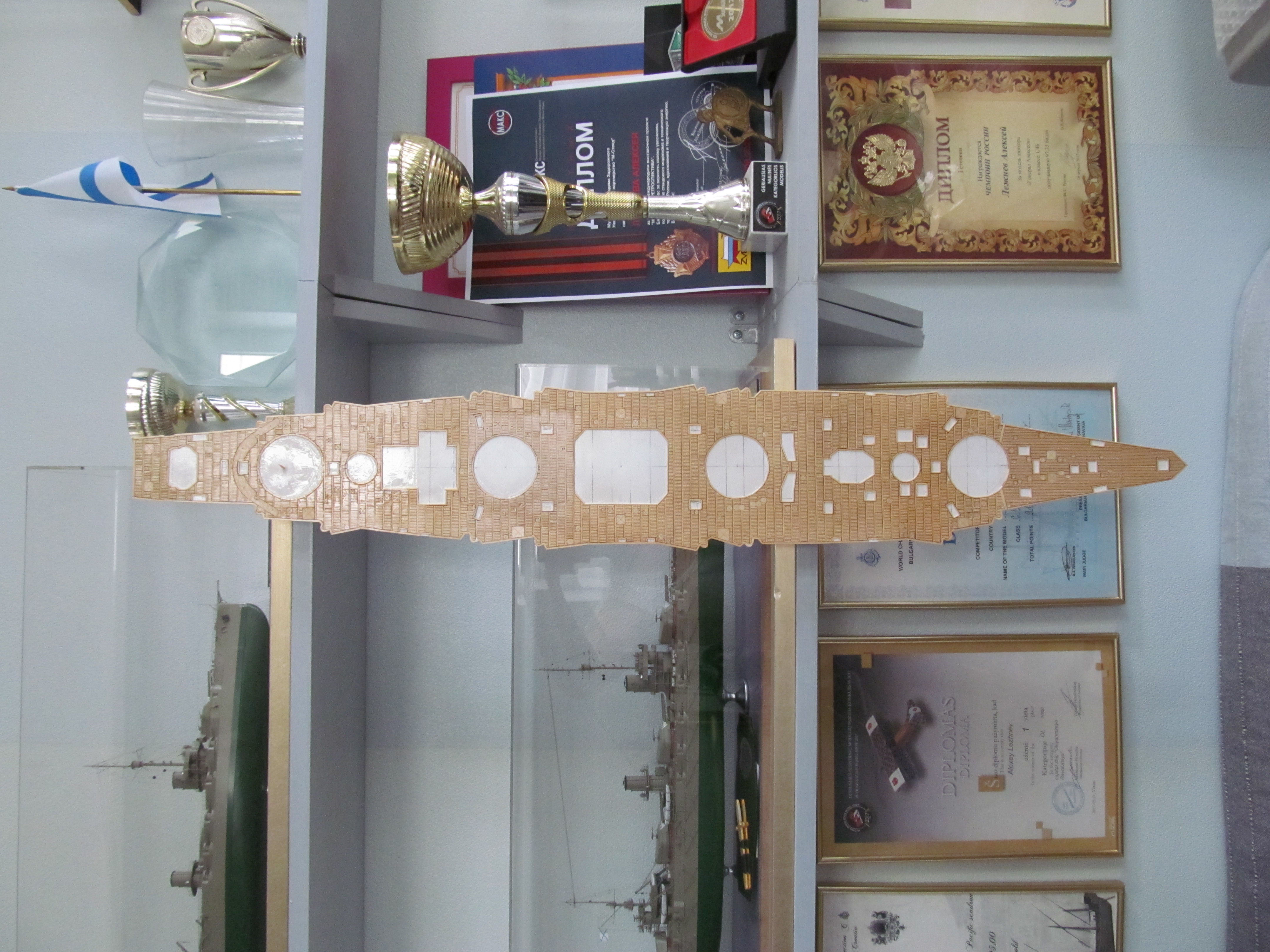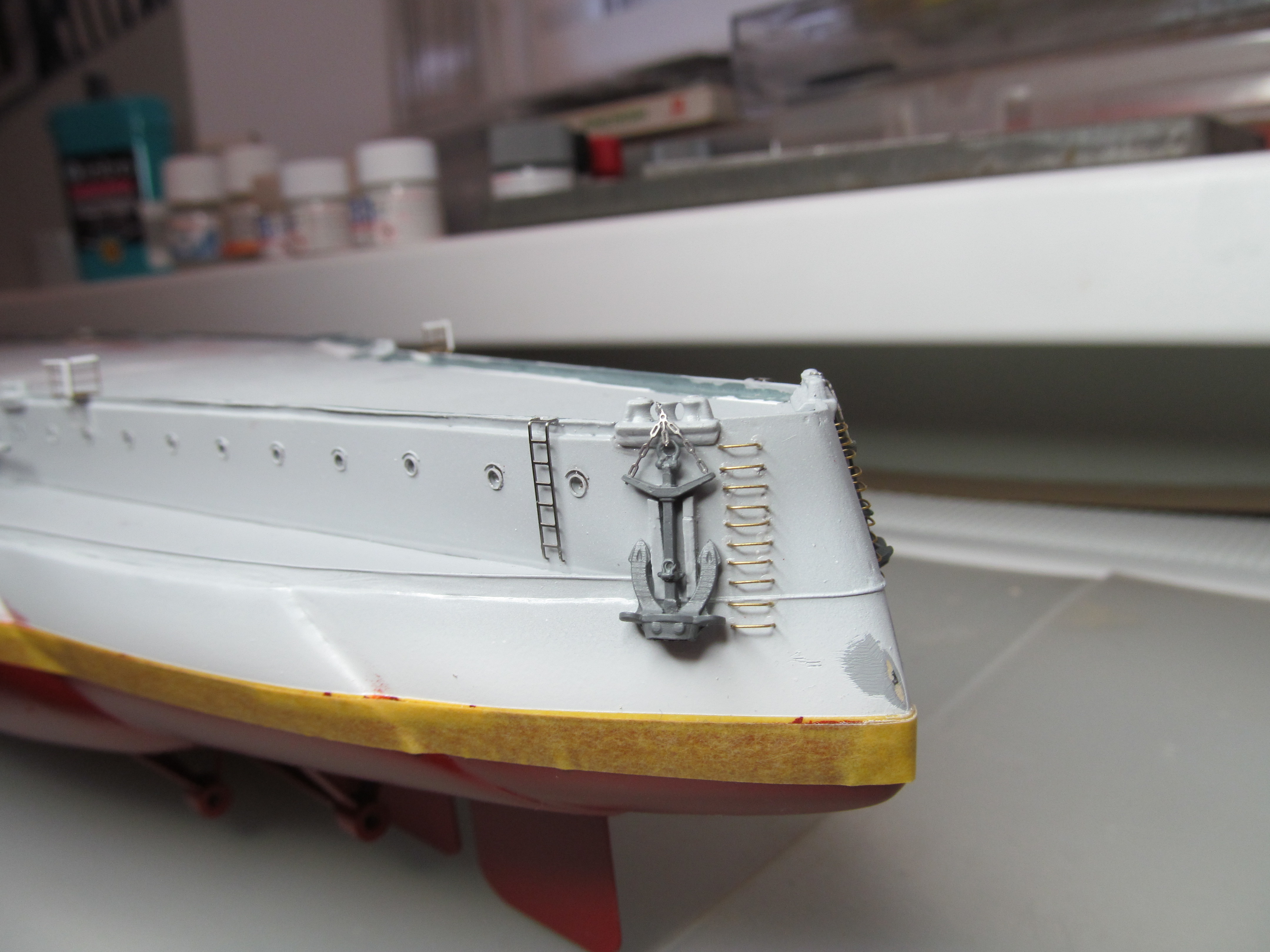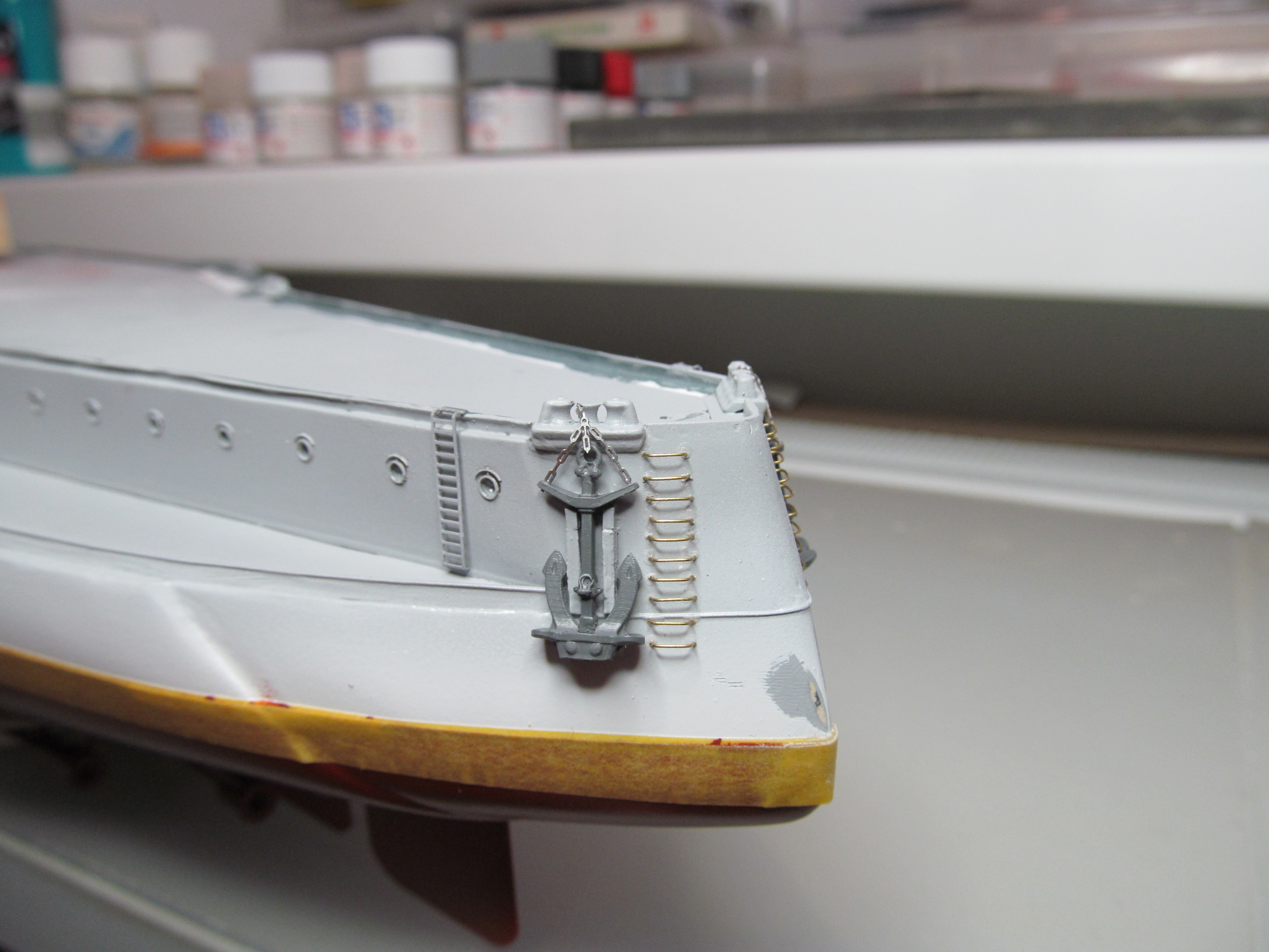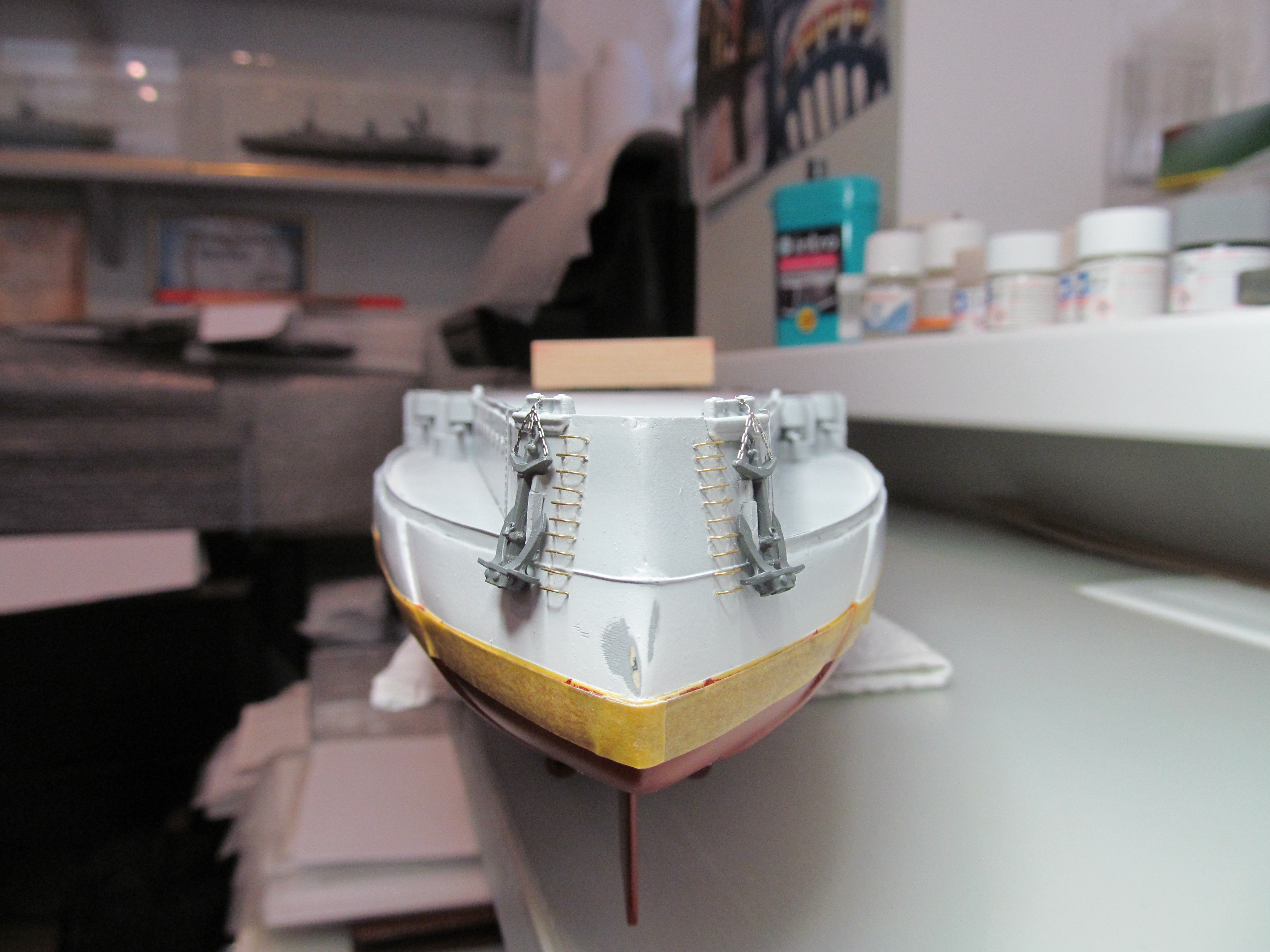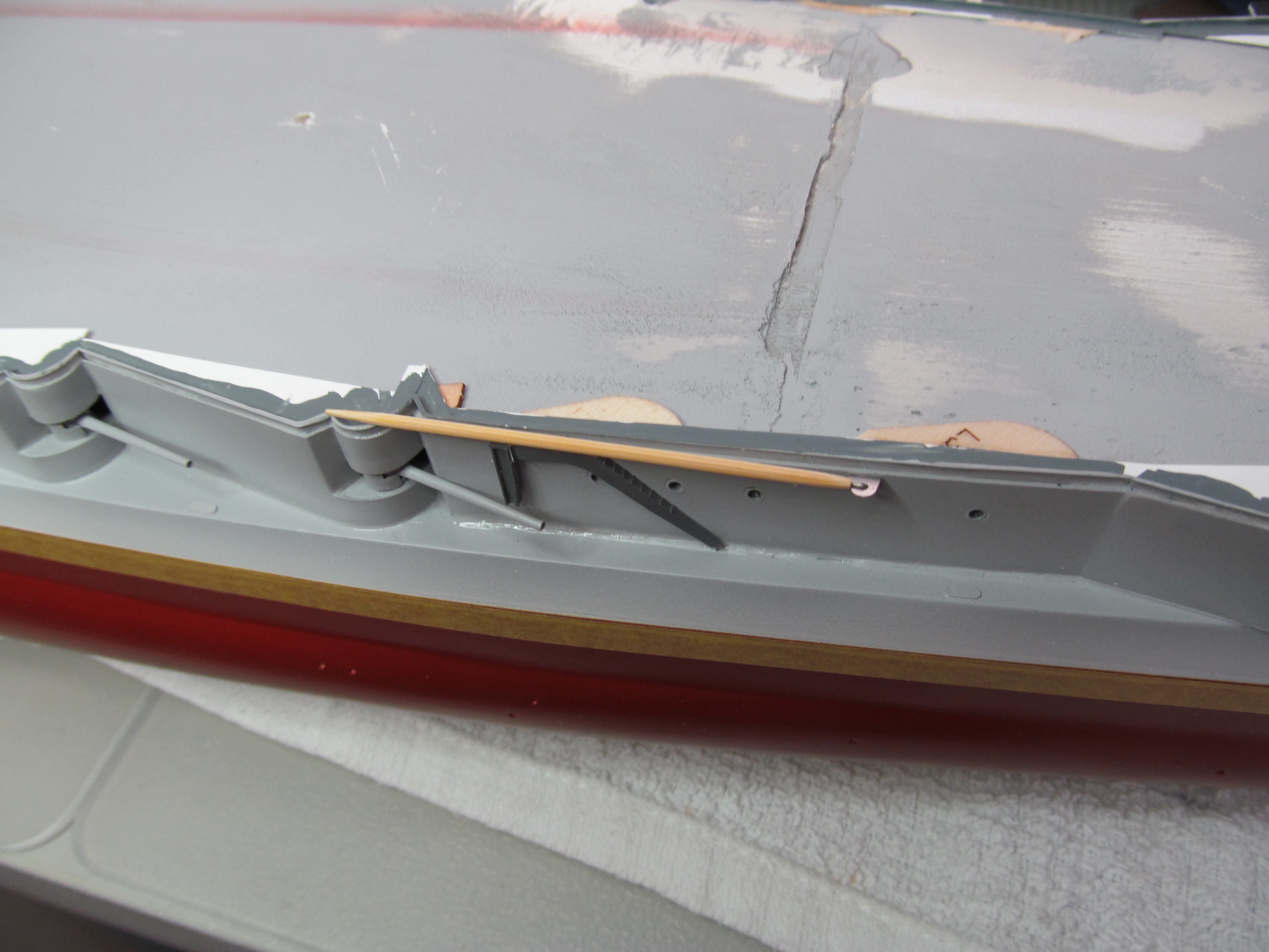 Алексей привет! Вы не переживайте. Вы не один,кто строит модель.За Вашими работами постоянно слежу. Вы молодец. По поводу темных пятен: я в том месте тренировался и это место закроется барбетом башни. Корабль планирую ставить в большую закрытую полку, где будут стоять еще модели. По поводу ограждений, спасибо, подумаю.