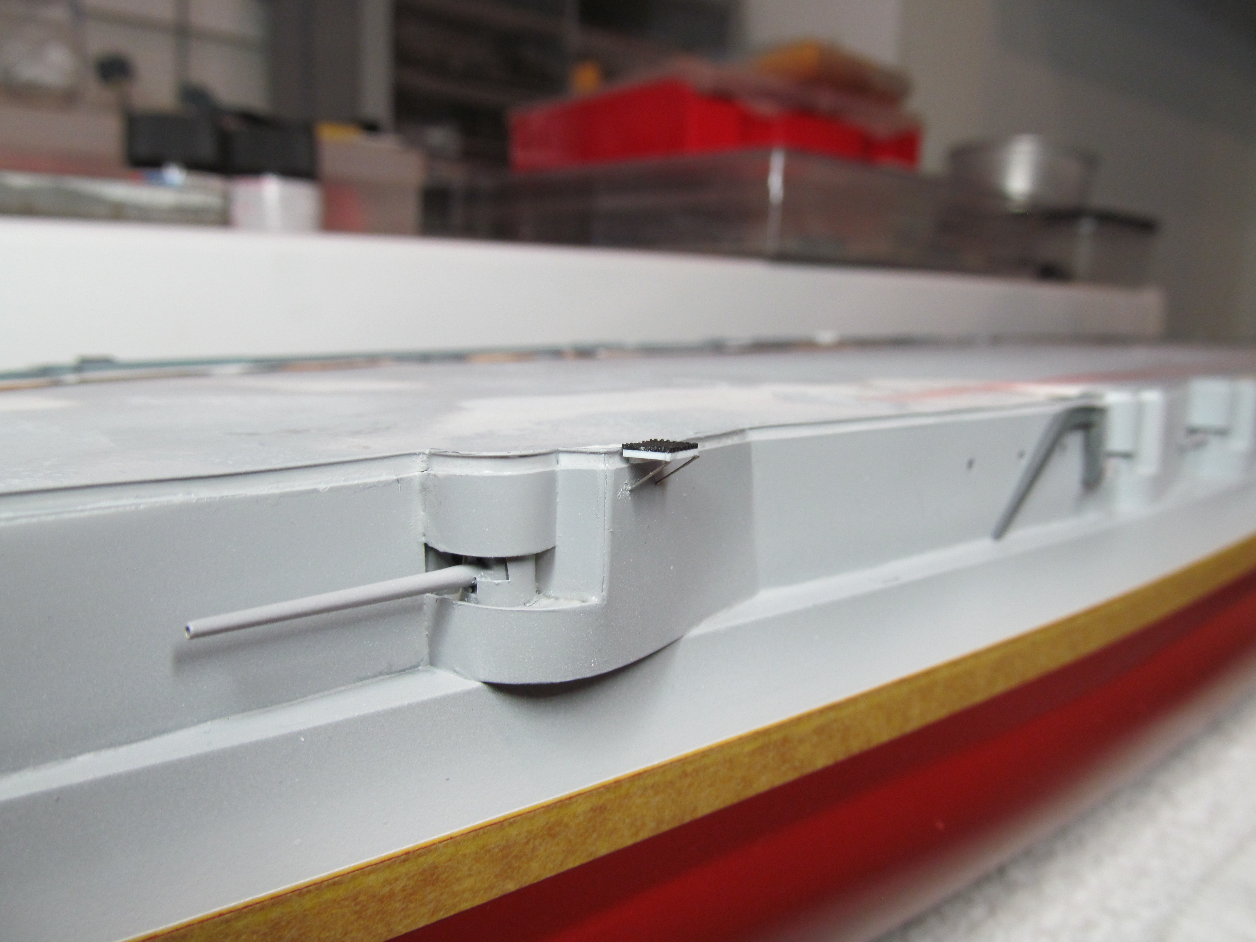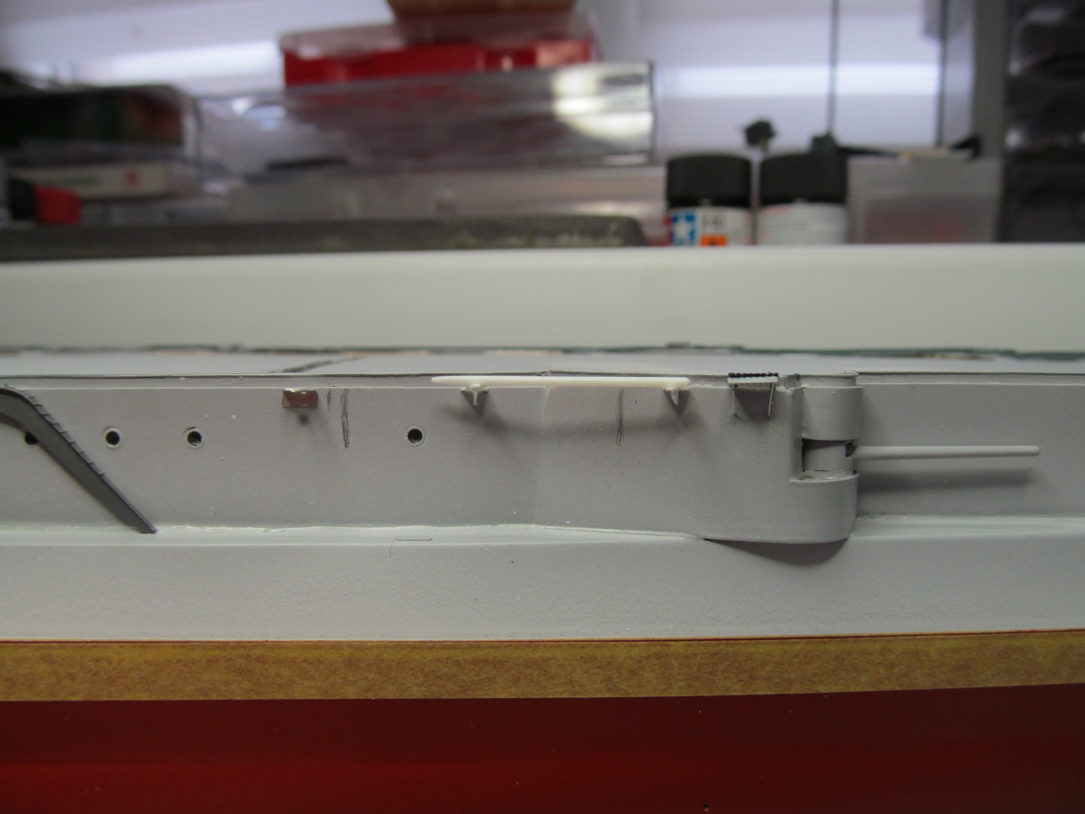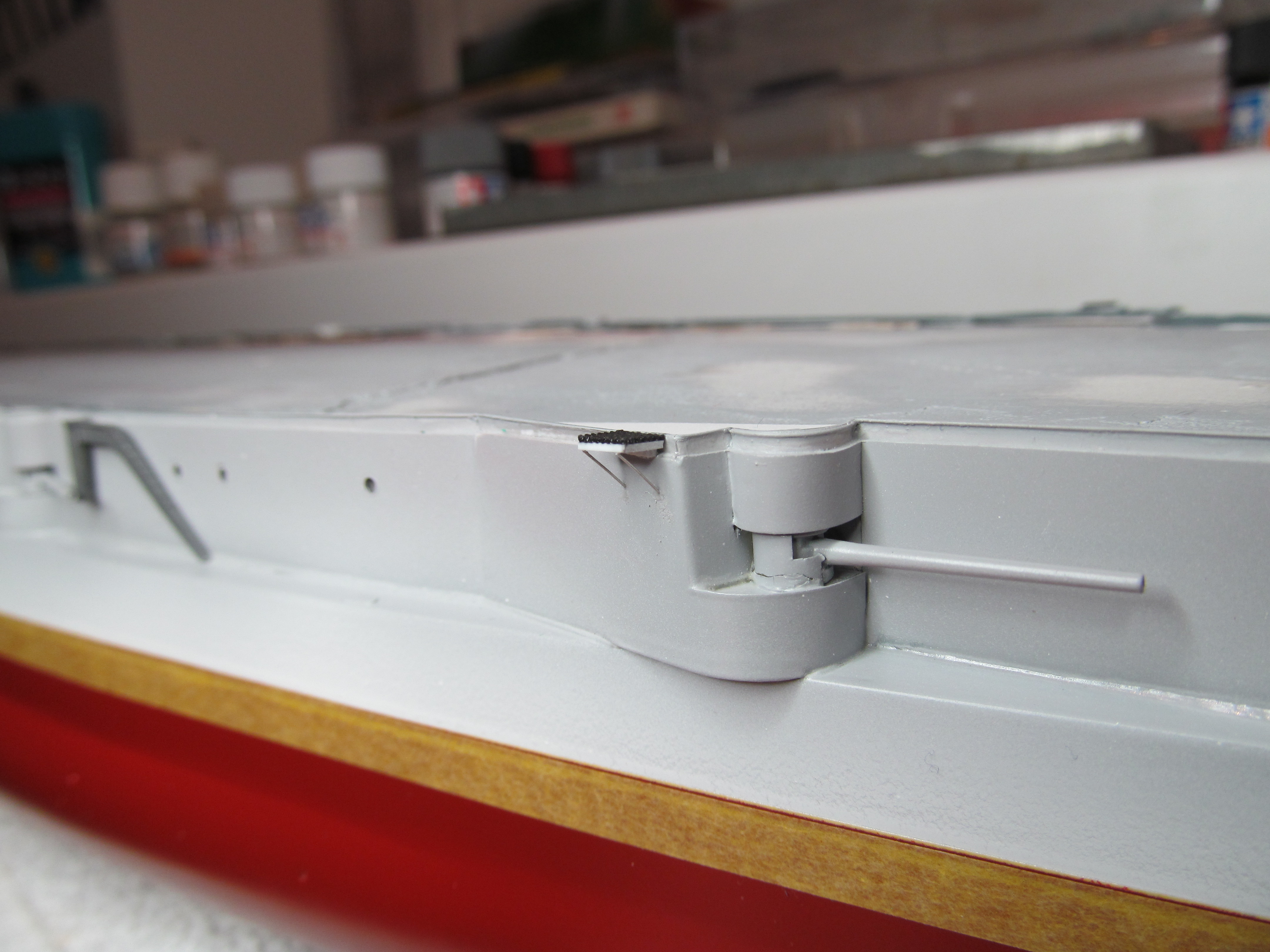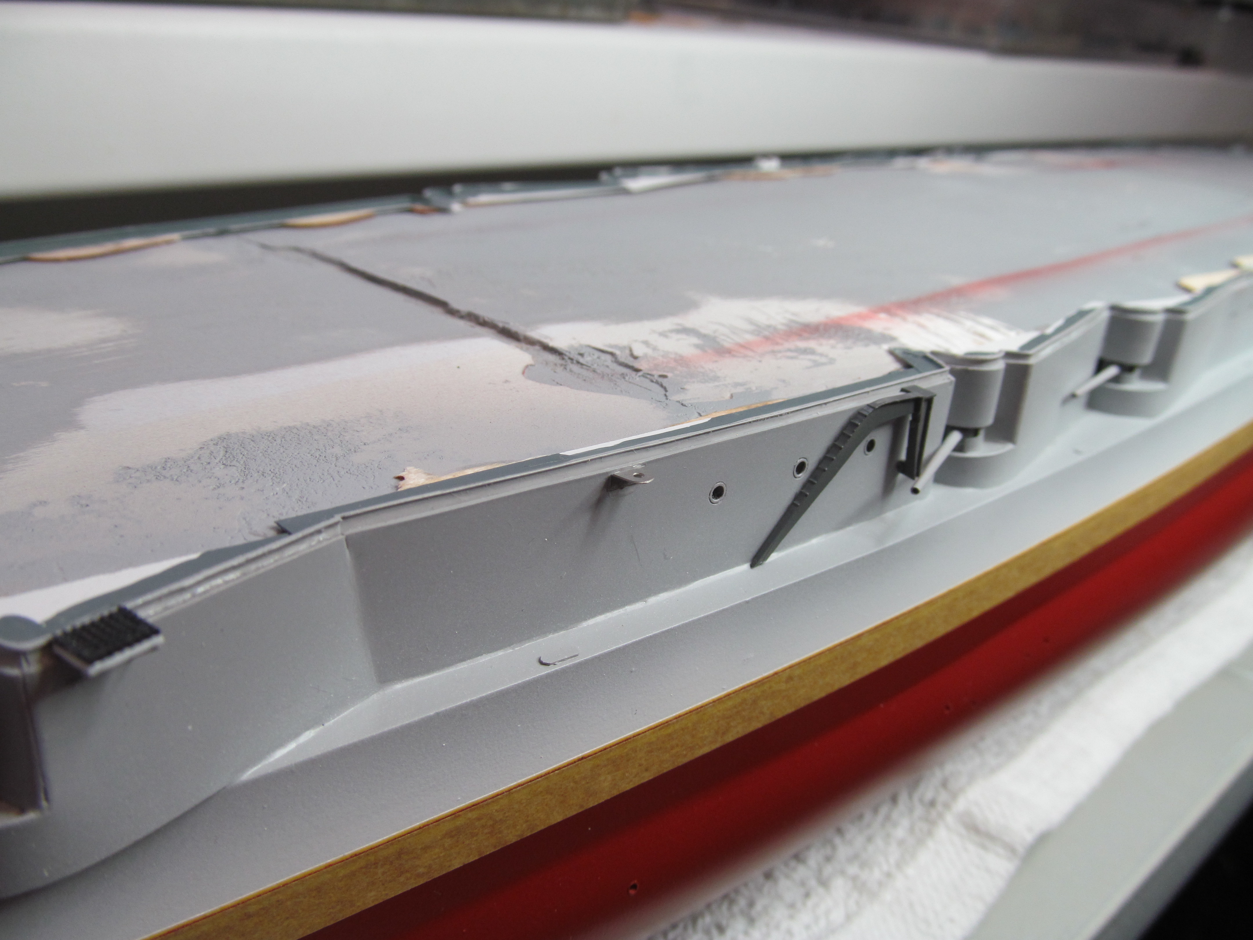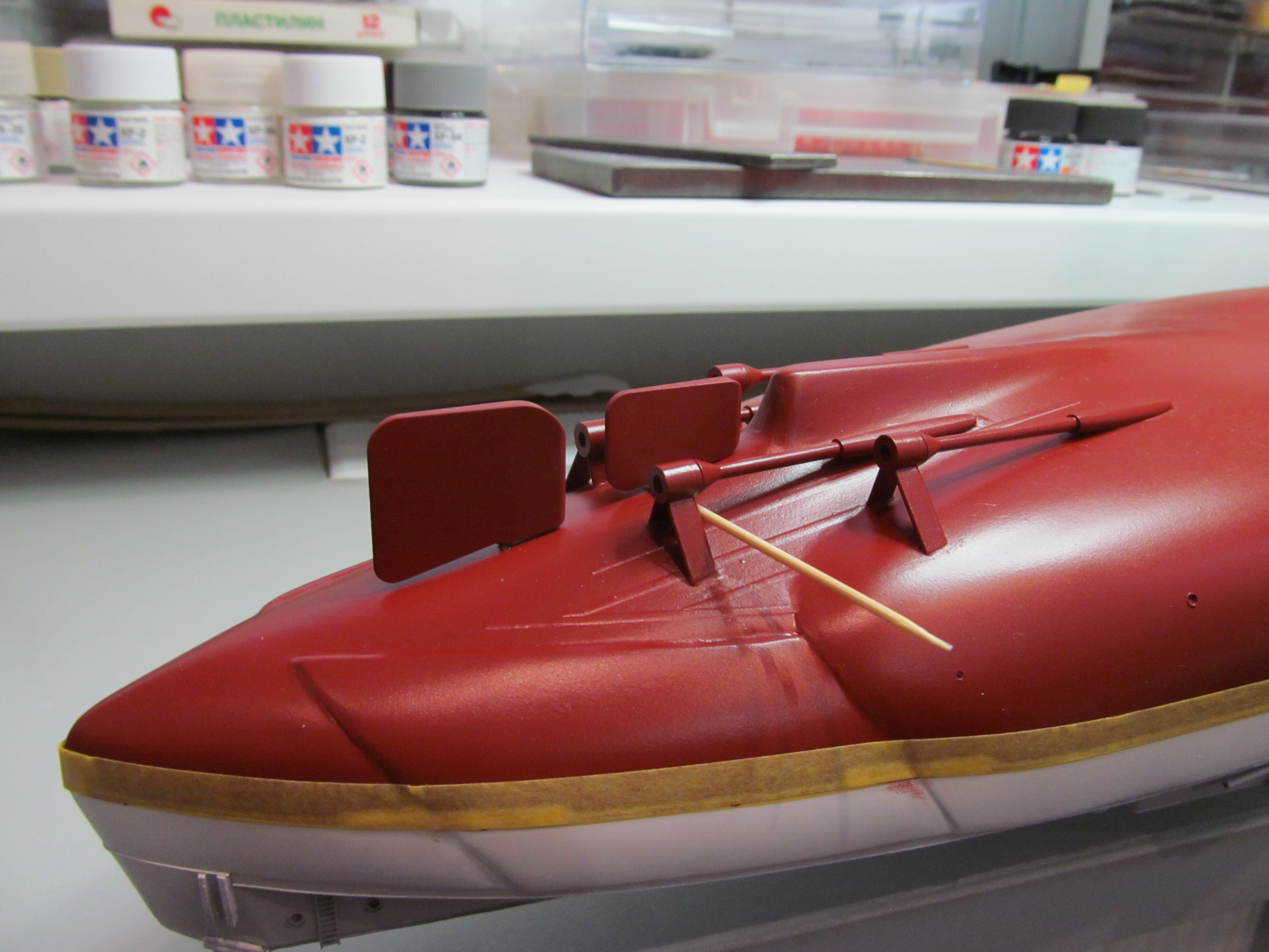 Алексей привет! Вы не переживайте. Вы не один,кто строит модель.За Вашими работами постоянно слежу. Вы молодец. По поводу темных пятен: я в том месте тренировался и это место закроется барбетом башни. Корабль планирую ставить в большую закрытую полку, где будут стоять еще модели. По поводу ограждений, спасибо, подумаю.