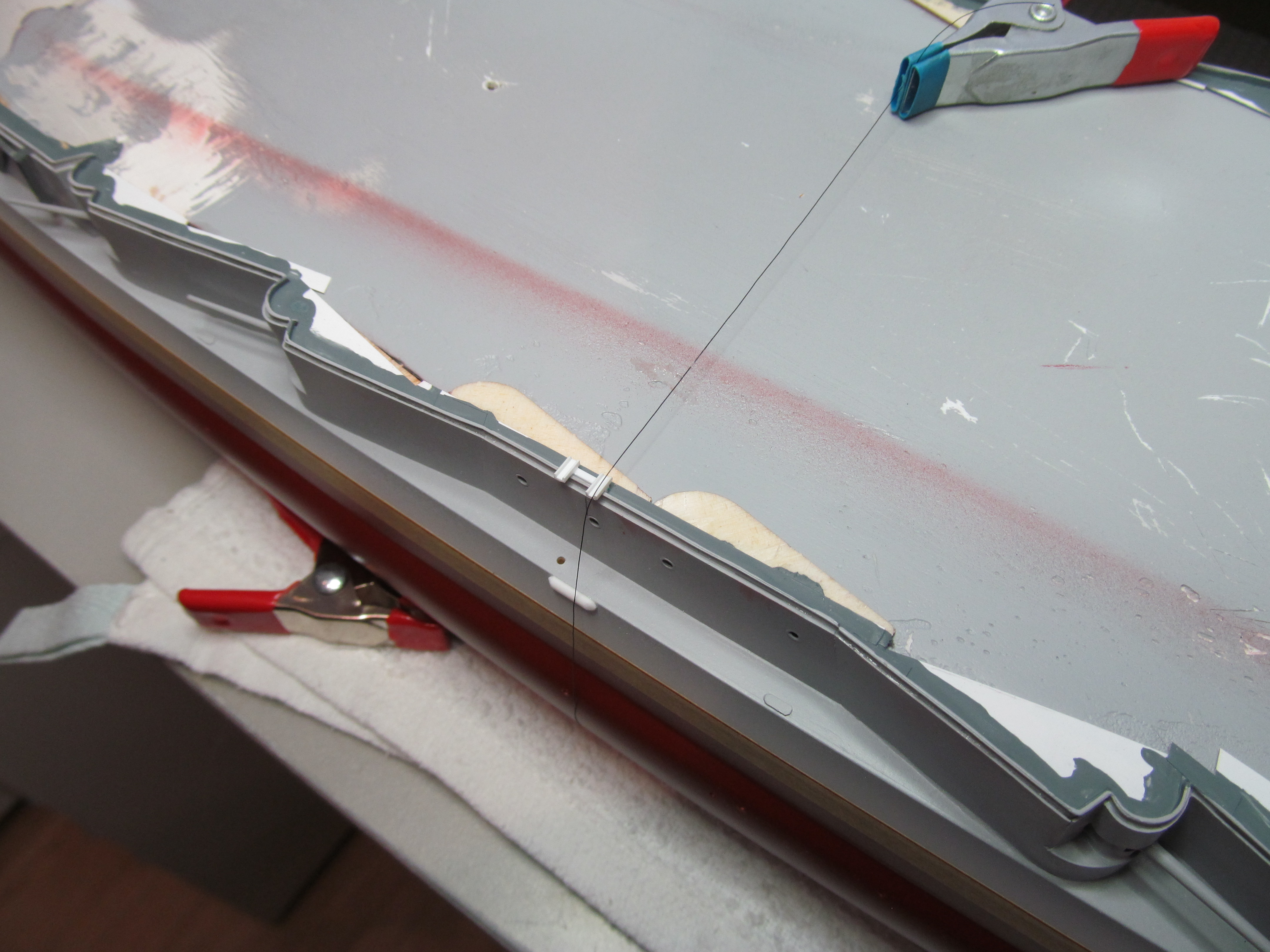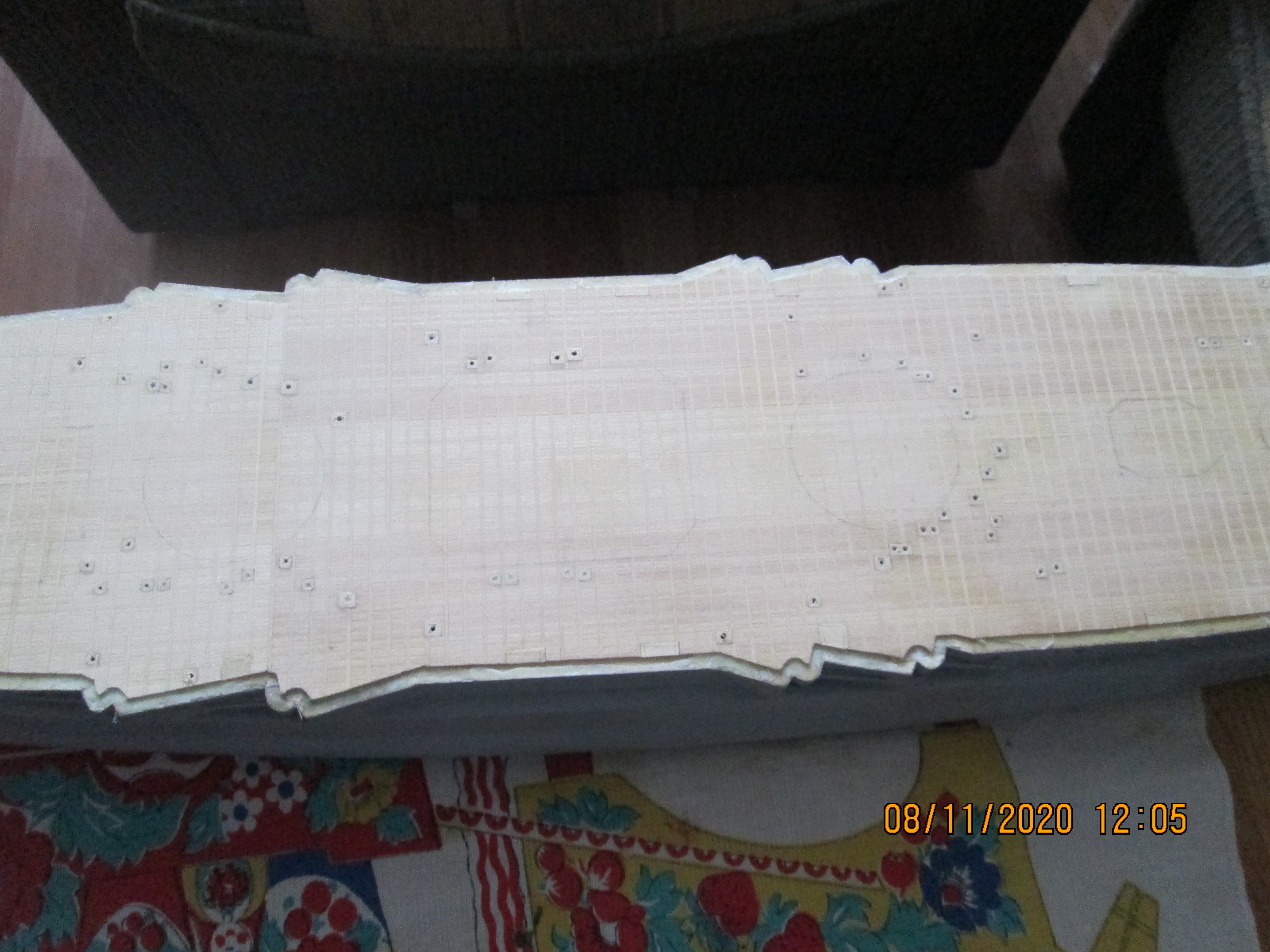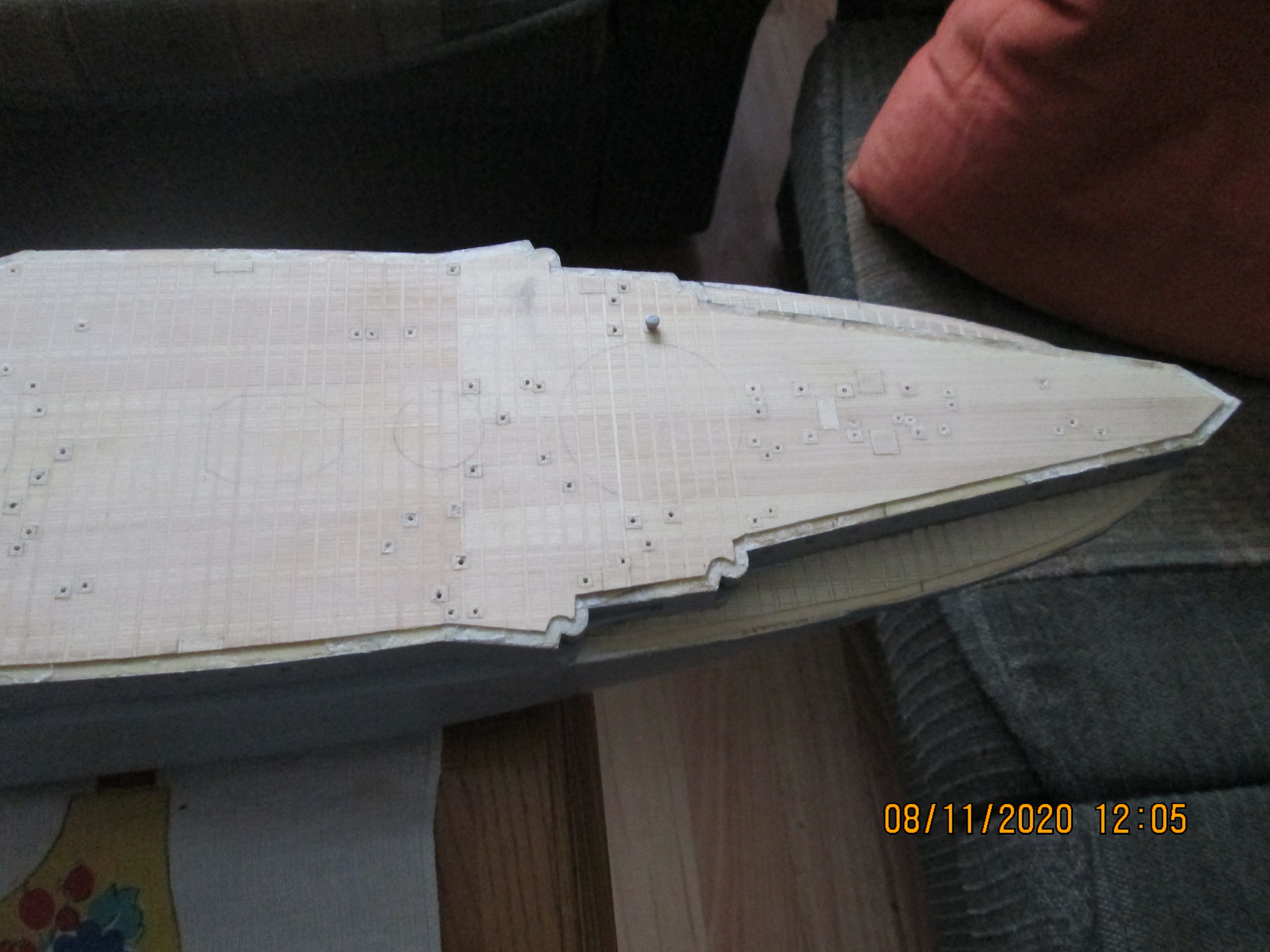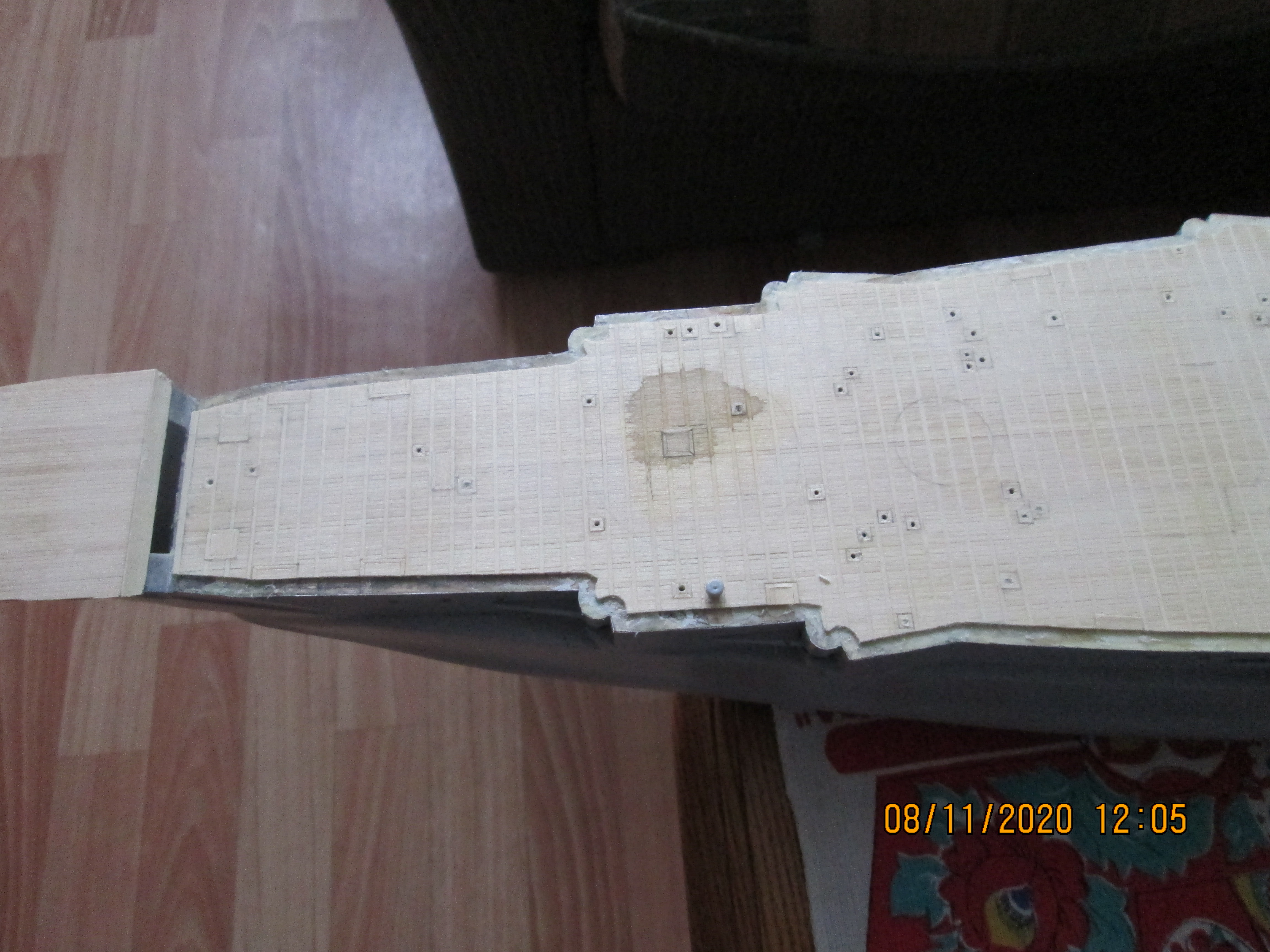 Всем привет! Давно я здесь не писал. Было мало времени на работу с моделью, но постройка понемногу идет.Доделал палубный настил (обрамление больших надстроек решил не делать) Следующий этап- монтаж ограждений и покраска корпуса.