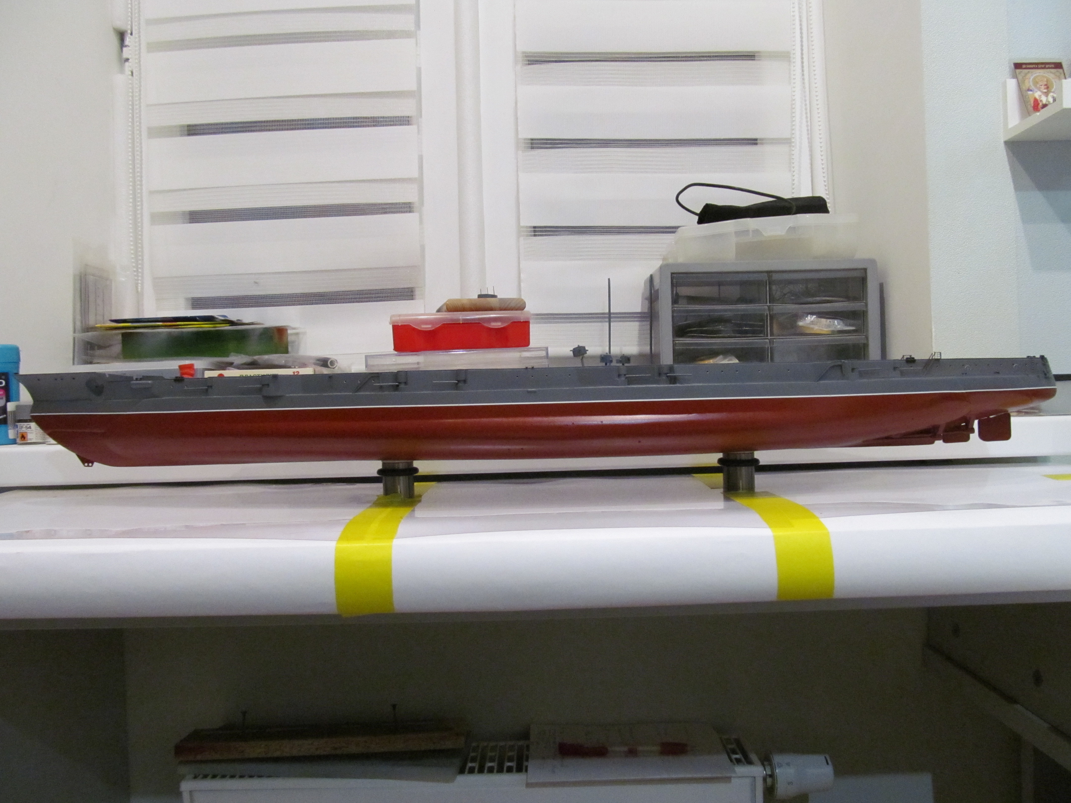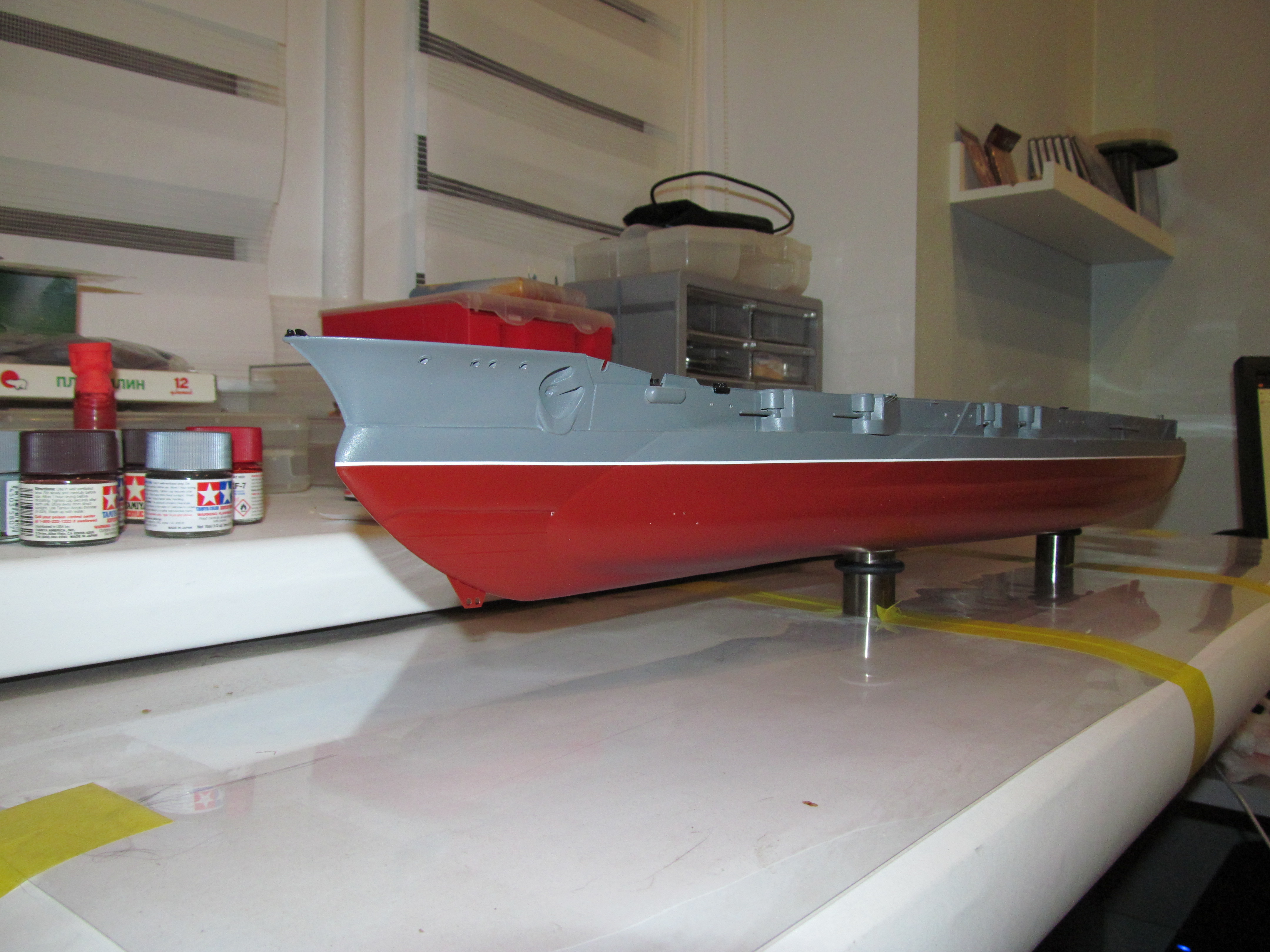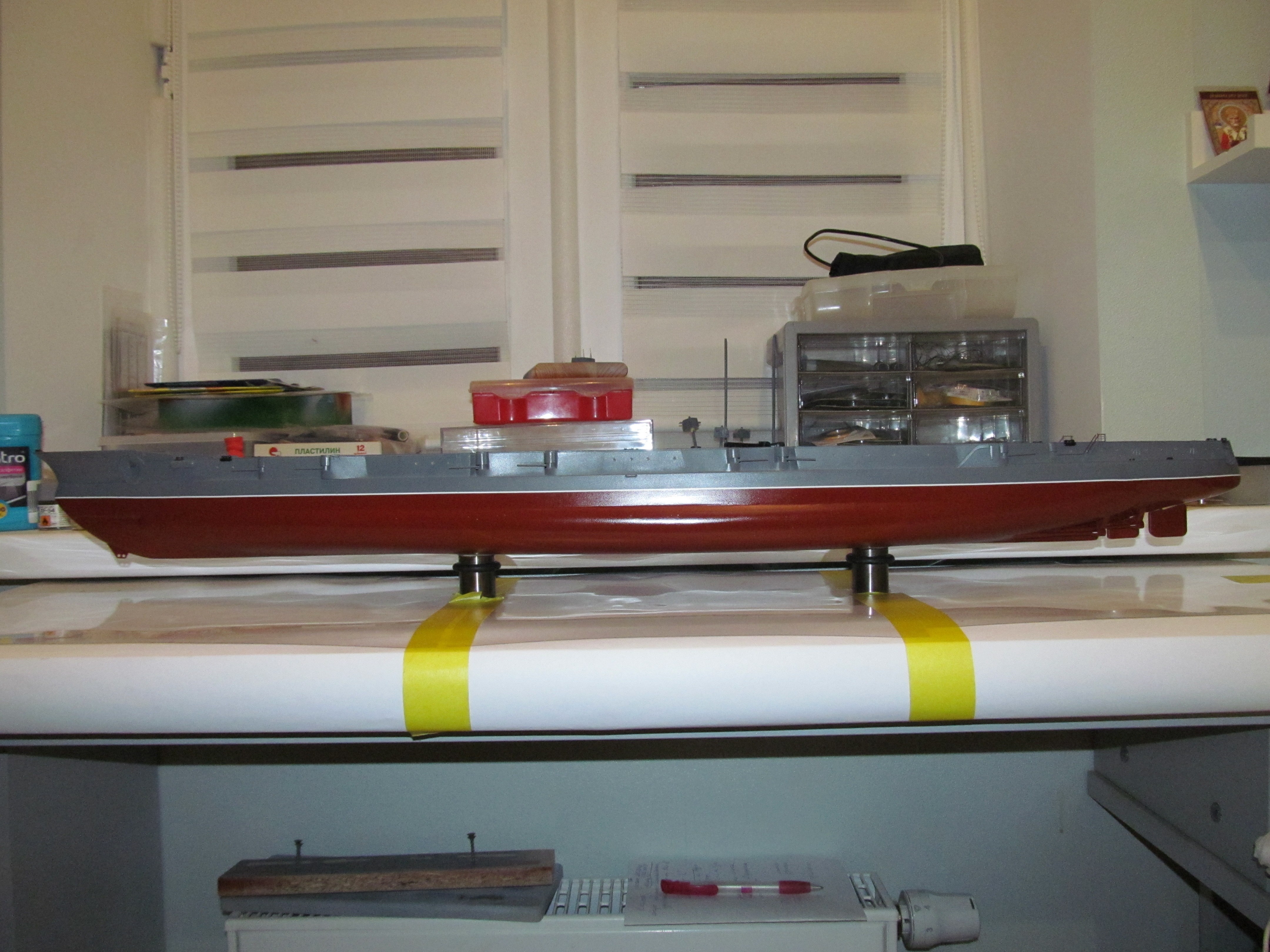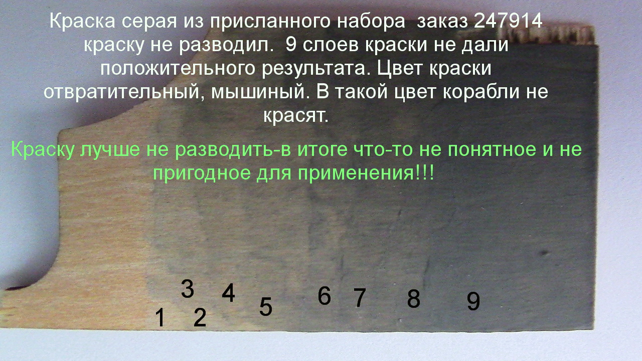 Так, например серая краска настолько не качественная, что затрачено огромное количество времени и попыток по достижению положительного результата. Но результата так и не получилось. И в разы краска отличается от ранее присланной краски серого (шарового) цвета. И покрашенные ранее детали линкора броневые башни, трубы зенитки и пр. не будут соответствовать цвету корпуса и надстроек модели.