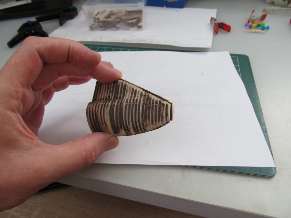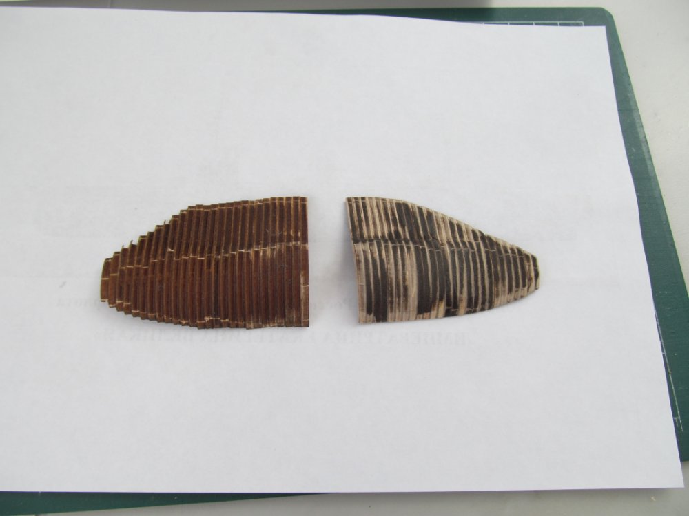 1. Вот для сравнения оголовки носовой части булей: слева - тот, что даёт ДеАгостини (явно с запасом), а справа - я уже подогнал к проектному контуру.