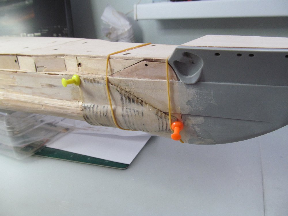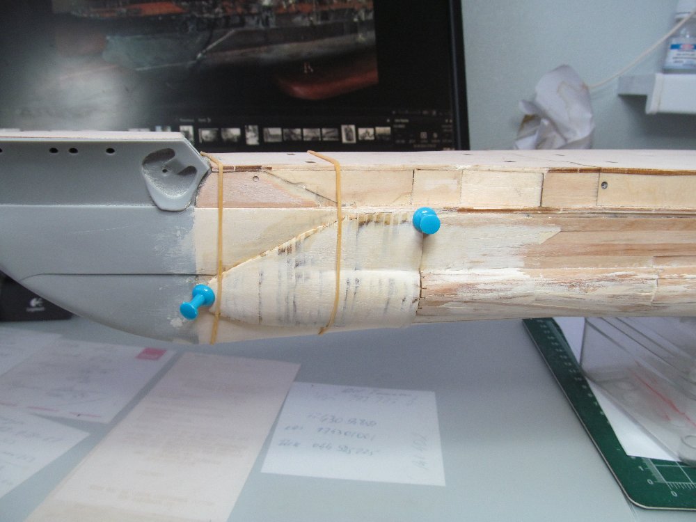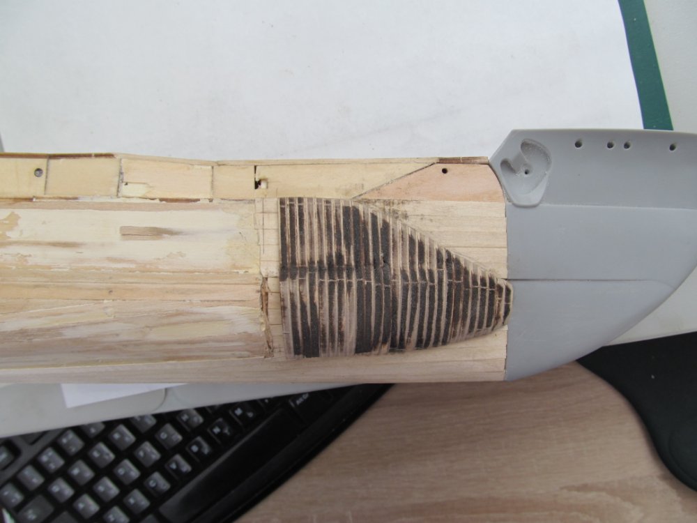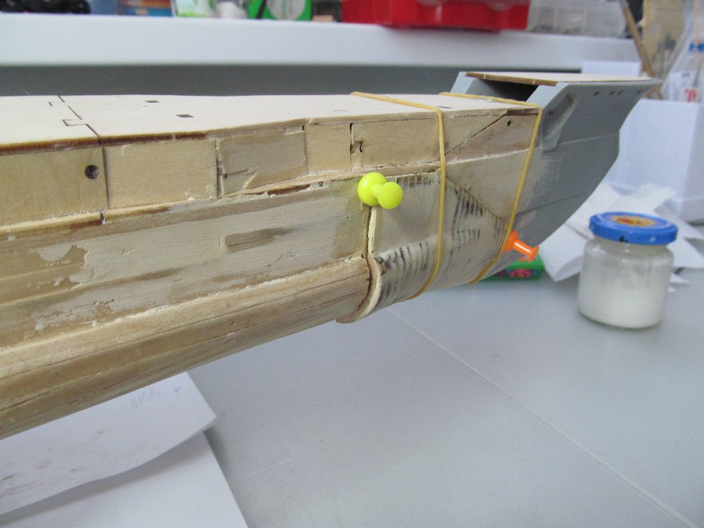 Дабы отработать чёткое примыкание и оформление оголовков булей, сначала выполнил чистовую обшивку непосредственно на носу модели.