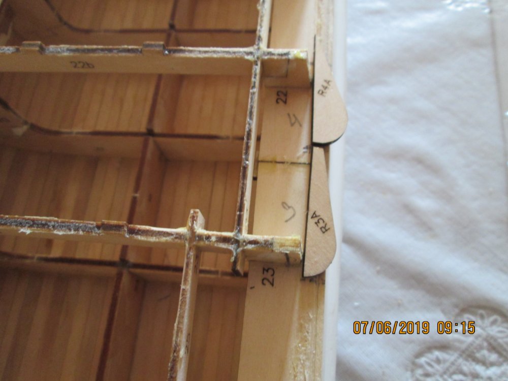 Здравствуйте! Продолжаю доработку модели. И так. Собрал казематы №3 и 4. Отметил их расположение. На шпангоуте №30 с торца срезал 3 мм. На шпангоутах № 28 и 26 срезал сверху 3 мм, снизу 2 мм что бы придать в этом месте наклон борта. На шпангоутах № 22 и 23 срезал по 5 мм. Из фанеры (2мм) под казематы № 3 и 4 сделал часть борта и приклеил к шпангоутам № 22 и 23.Основную часть борта обрезал по размерам и соединил вставкой с площадкой под казематами. Получилось ступенька. Результатом очень доволен. Фото ниже.