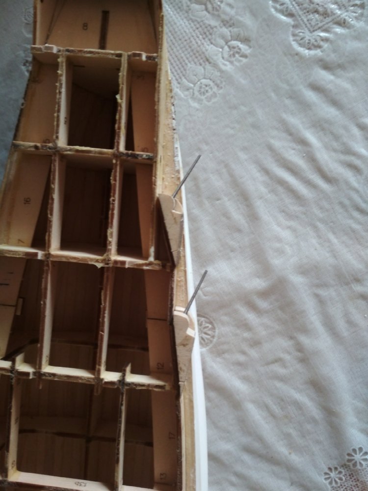 Здравствуйте! Закончил переделку правого борта: собрал казематы 7 и 8, отмерил их расположение, подрезал торцы шпангоутов, деталь №58 укоротил на 15 мм (в размер каземата №8), под казематы 5 и 6 пришлось сделать небольшое углубление в корпусе. Пришлось повозиться с частью борта, соединяющую казематы 4 и 5 (борт имеет наклон).Теперь борт с казематами соответствует оригиналу. Результатом доволен. Фото.