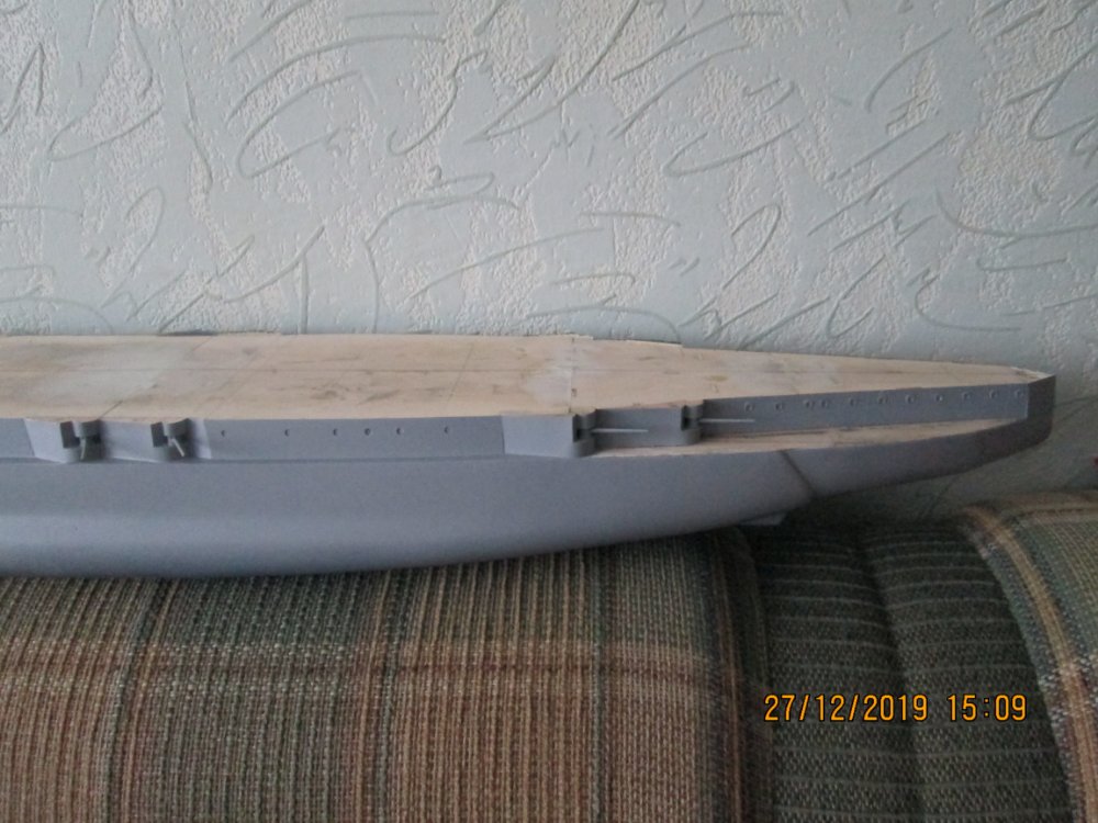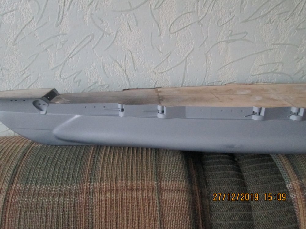 Сам корпус проблем не доставил (не считая не соответствие размеров и расположения казематов) Шпаклевка+шкурка, шпаклевка+шкурка и т.д. Много пыли и монотонных движений. А вот с поясом казематов пришлось сильно повозиться. Этот пояс- самая видная часть корпуса. Состоит из трех основных элементов: казематы (обклеивал металлом из пивных банок), сам пояс( использовал с доработками травление от издателя), "полка" под казематами ( дерево+шпаклевка) Самое трудное было- это выровнять "полку" ( я думал просто: нанесу шпаклевки и обработаю шкуркой, но каждый раз то не ровные углы, то не ровная поверхность , то вылезало структура дерева) В общем намучился я с этим элементом. Даже пришлось сделать спец инструмент, очень помог ( расплющил гвоздь, сделал лопатку и приклеил шкурку) Если кто еще данные работы не делал, советую делать как Алексей: заклеить "полку" или металлом или пластиком. Так будет лучше и проще.Так же стыки между основными элементами (трудно подобраться, что бы нанести шпаклевку и зашкурить) Поменял грунтовку как советовали раньше на автомобильную. Сразу же другое дело: лучше ложится и затянула мелкие риски. Теперь настроился на палубу. Планирую приклеить разрезанные рейки из набора и пропитать льняным маслом. Може кто то посоветует другой вариант? И вопрос к Алексею: из чего изготавливался решетчатый настил на ярусах надстроек: дерево или металл? Теперь фото.
