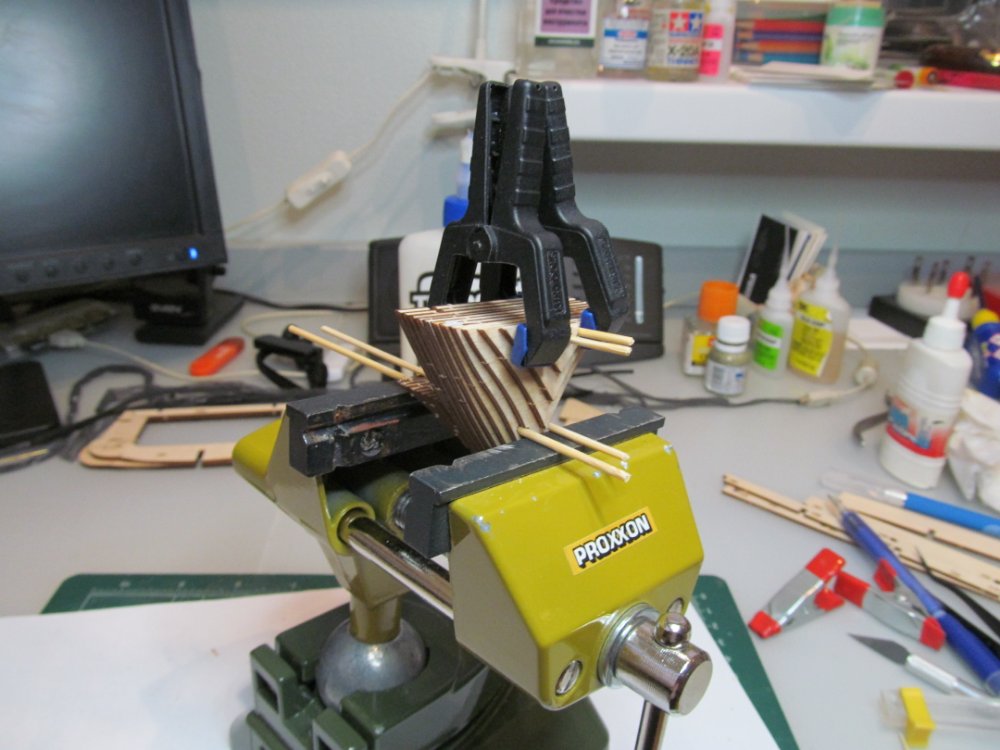 Продолжение. Почему-то выложилось по два фото, но я надеюсь, что участники форума поймут. Дальше шпангоут отодрал от киля с помощью пилки для ручного лобзика и модельного ножа, струбциной поджал шпангоут, что бы нормально сел, ну и вот результат
