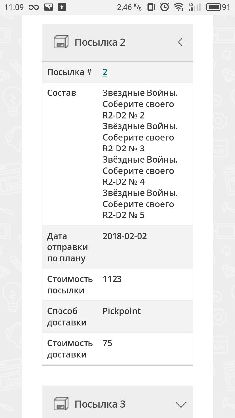 ElenaIv писал(а): 05 янв 2018, 12:48 Добрый день. Подписка номер 231444. Подписались с первого номера, оплата картой. За первую посылку с одним первым номером деньги списались. На данный момент в личном кабинете 3 посылки - 1 с выпуском #1 оплаченная; 2 с выпуском #1 опять неоплаченная с надбавкой за премиальную подписку 196 рублей (что за ерунда, товарищи? Надбавка 49 руб. за один выпуск, в посылке один, а вы за 4 хотите?); 3 с выпусками #2-5, но без скидки за оплату картой.
